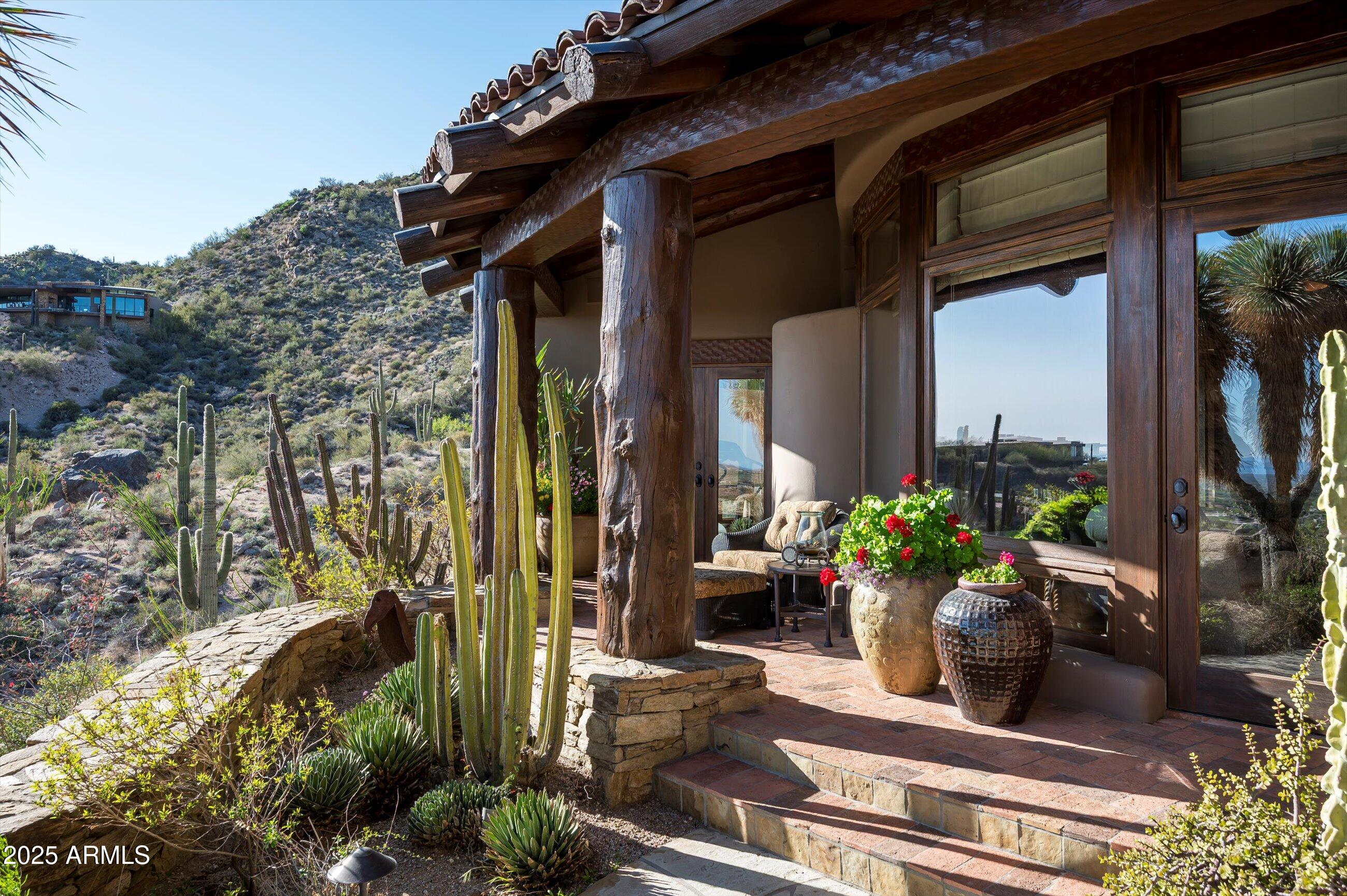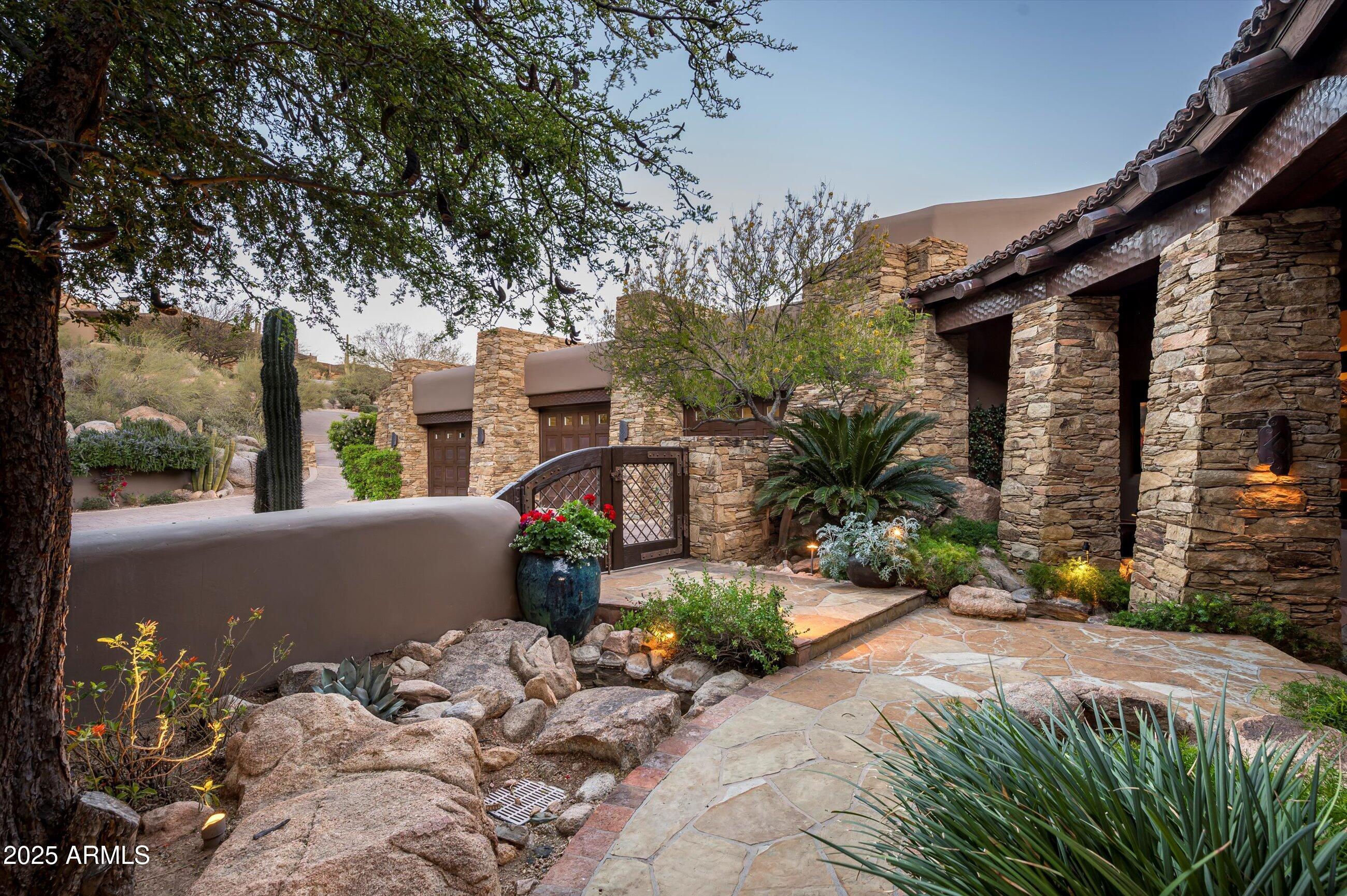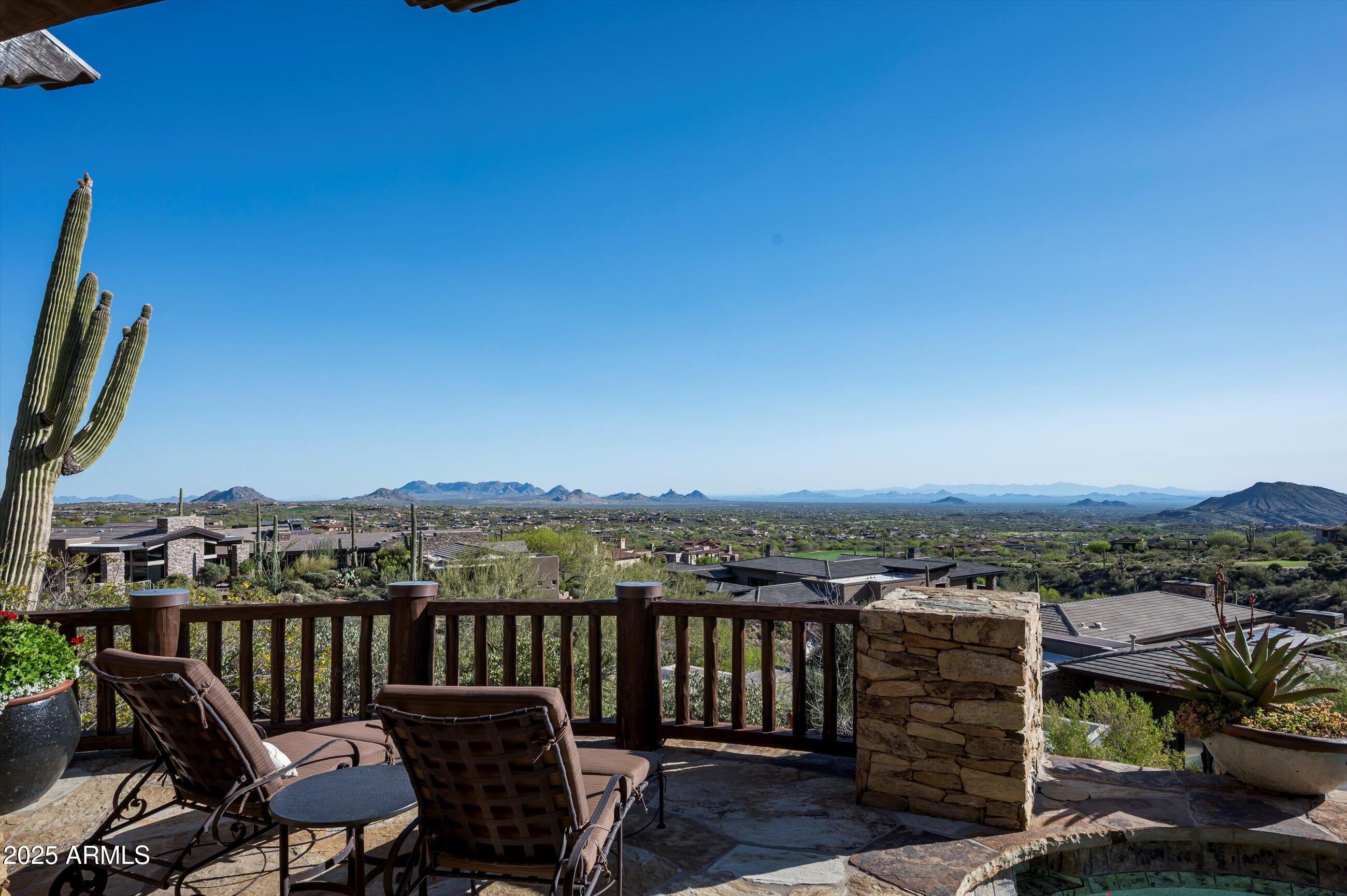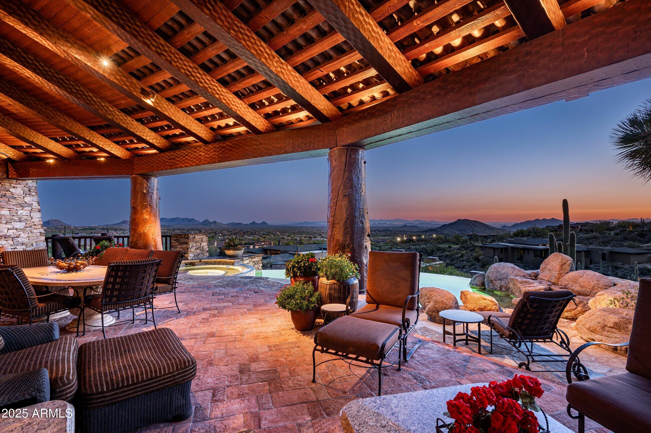 Golf membership available! Experience timeless desert living in this stunning Lee Hutchison-designed masterpiece, perfectly positioned to capture sweeping down-valley views, glowing sunsets, and twinkling city lights. Superior craftsmanship with natural stone and wood beams, this 4-bedroom, 4 bath & 2 1/2 baths estate blends design with elegance and modern comfort. Featuring a chef's kitchen with premium appliances and custom cabinetry, flowing seamlessly into the great room with exposed beams, artisan details, and expansive glass walls. The home offers two dedicated offices, detached guest casita, and flex room. Designed for Arizona's iconic indoor-outdoor lifestyle, the home offers 180-degree covered patios, an outdoor fireplace lounge, built-in BBQ, and lush desert landscaping. Offered furnished with some exceptions.