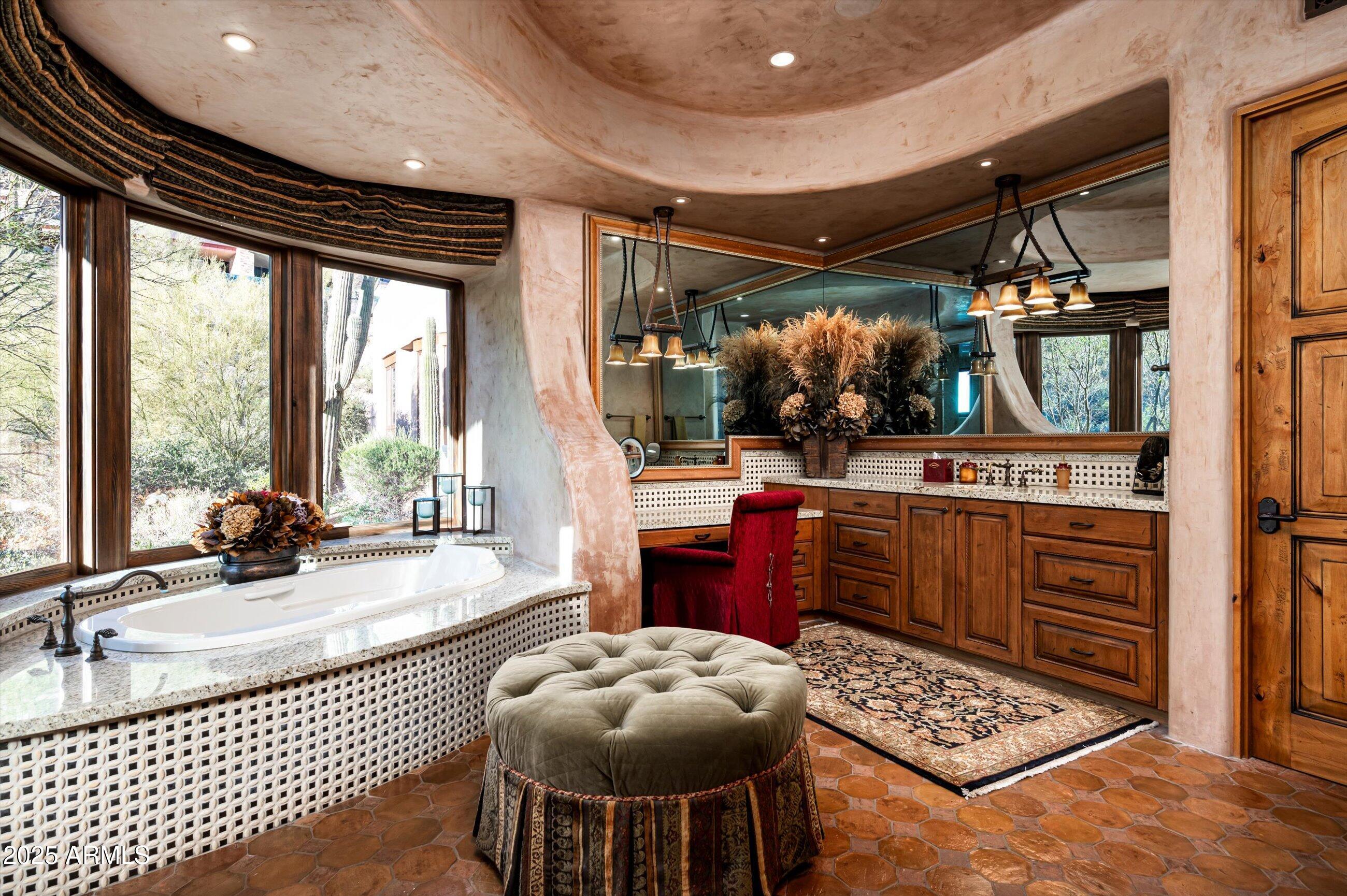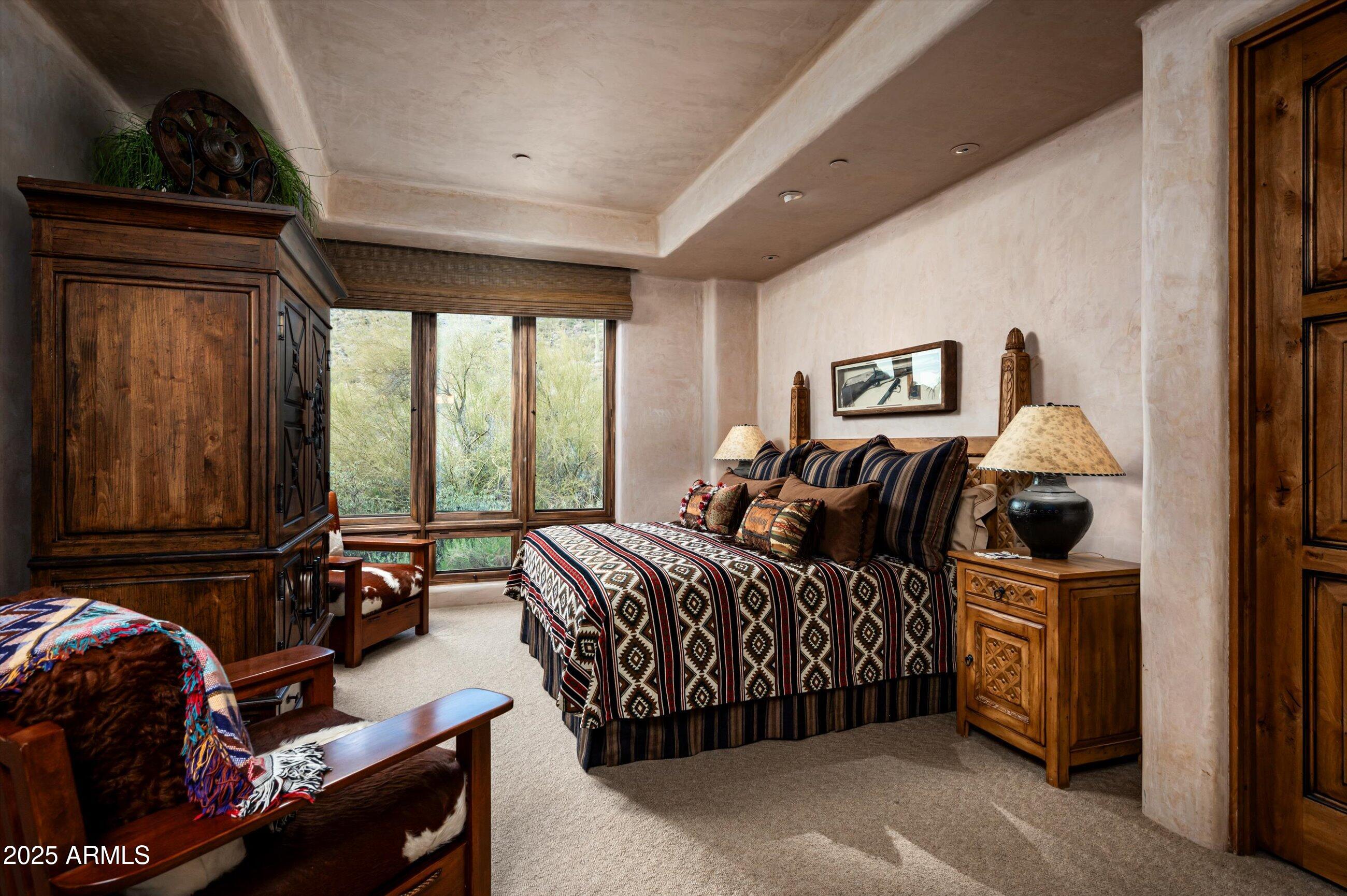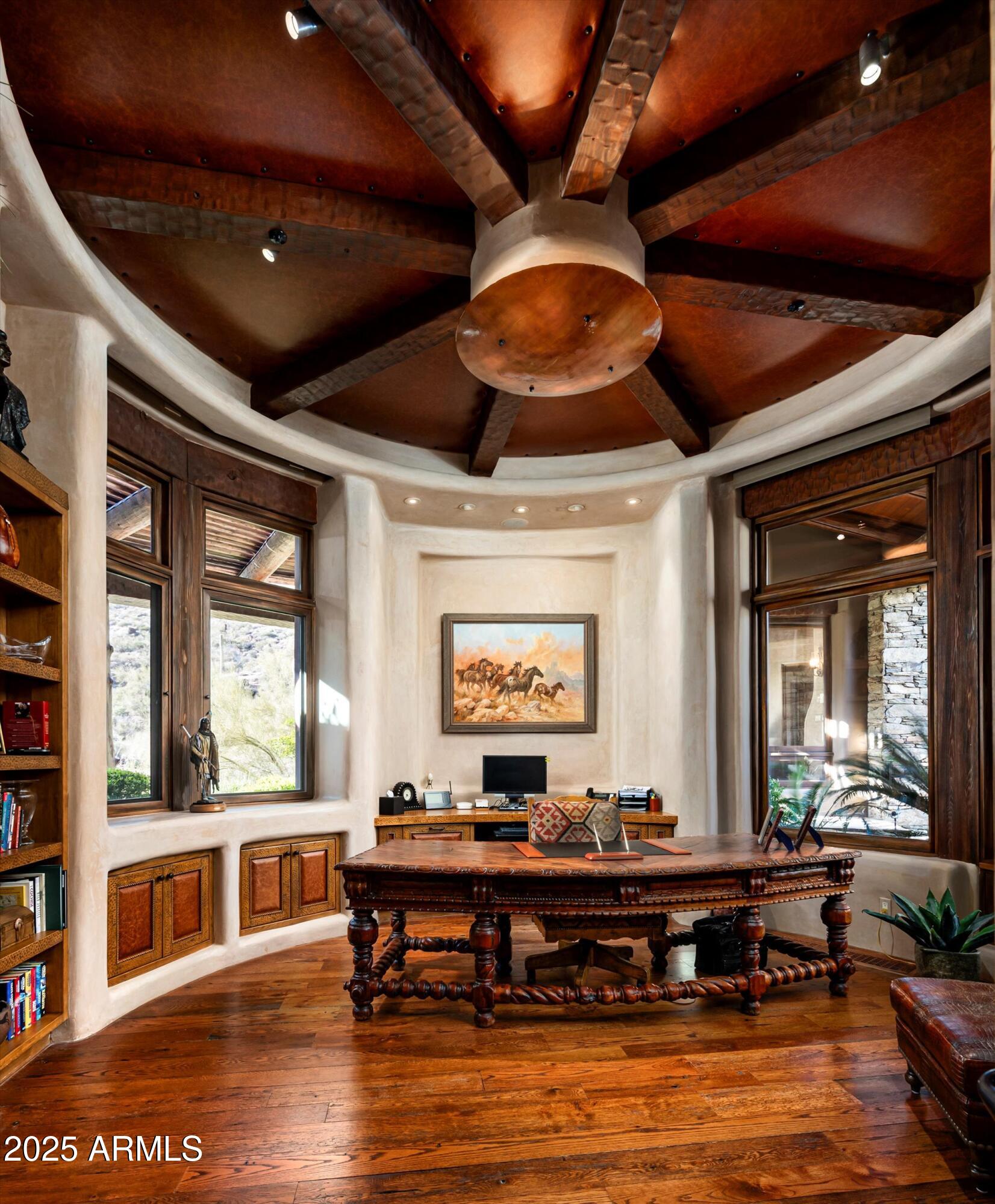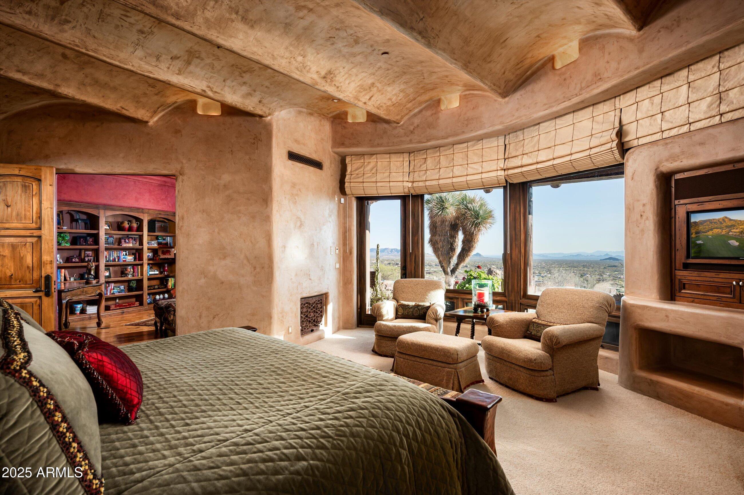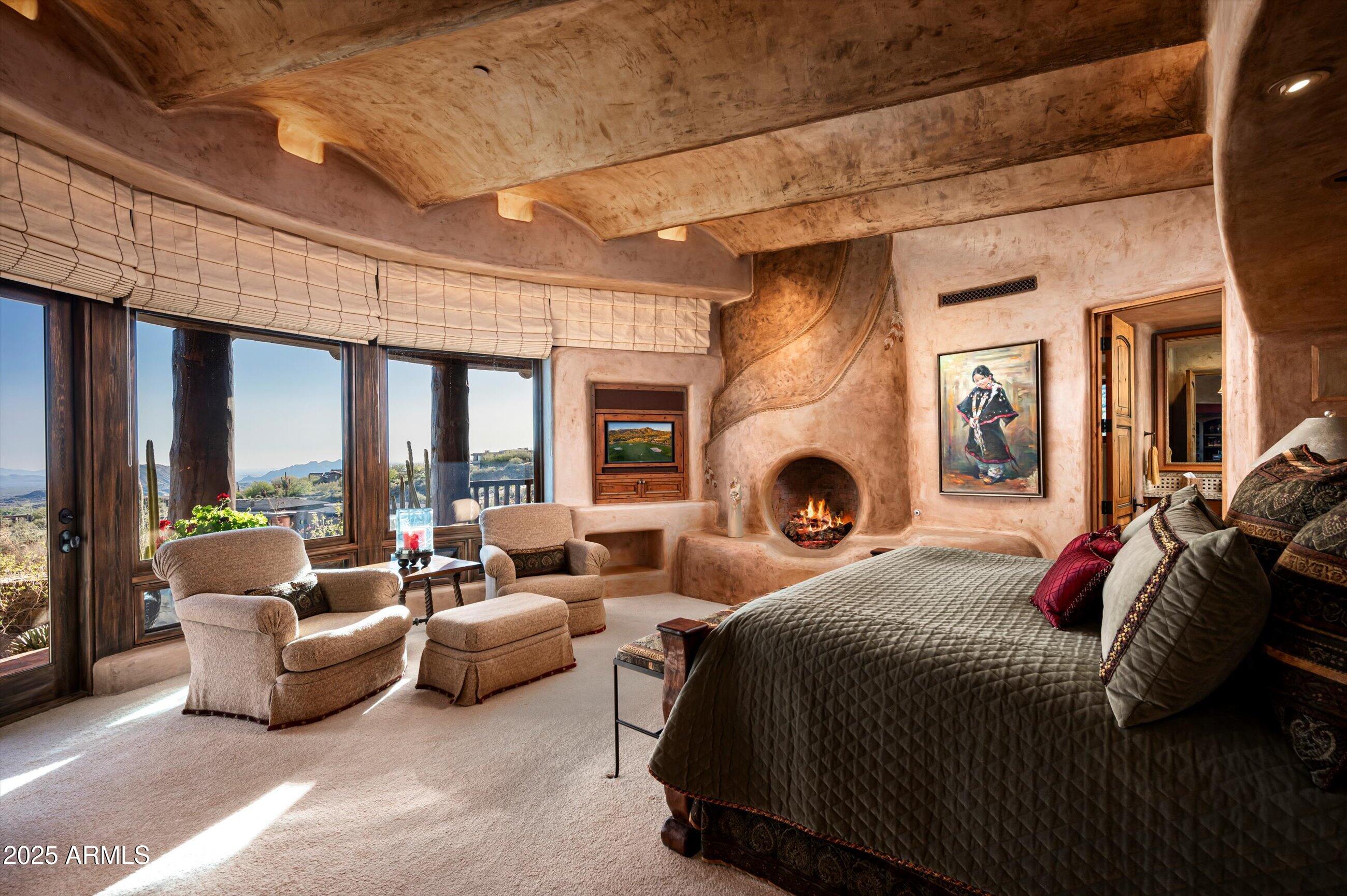Golf membership available! Experience timeless desert living in this stunning Lee Hutchison-designed masterpiece, perfectly positioned to capture sweeping down-valley views, glowing sunsets, and twinkling city lights. Superior craftsmanship with natural stone and wood beams, this 4-bedroom, 4 bath & 2 1/2 baths estate blends design with elegance and modern comfort. Featuring a chef's kitchen with premium appliances and custom cabinetry, flowing seamlessly into the great room with exposed beams, artisan details, and expansive glass walls. The home offers two dedicated offices, detached guest casita, and flex room. Designed for Arizona's iconic indoor-outdoor lifestyle, the home offers 180-degree covered patios, an outdoor fireplace lounge, built-in BBQ, and lush desert landscaping. Offered furnished with some exceptions.