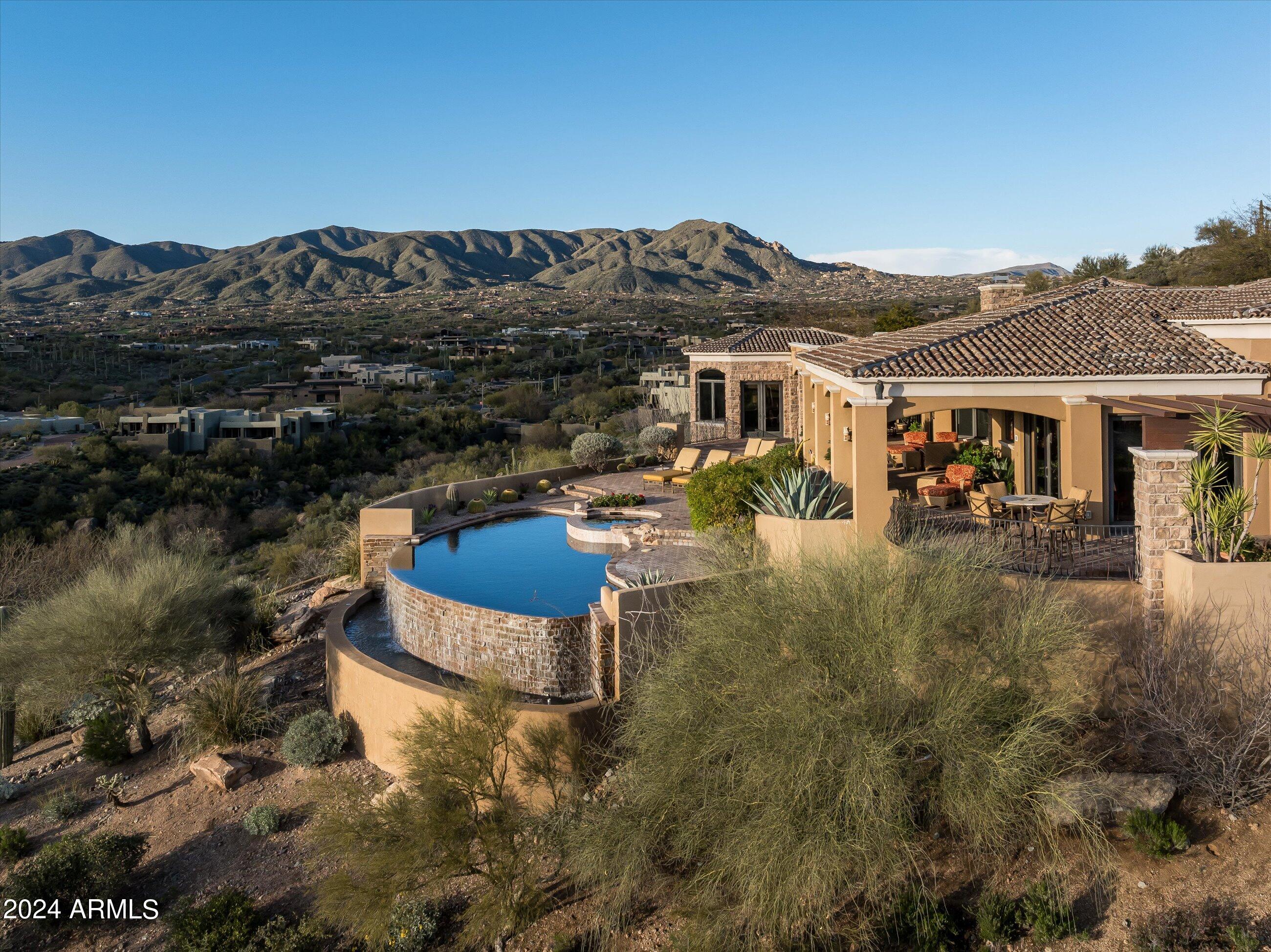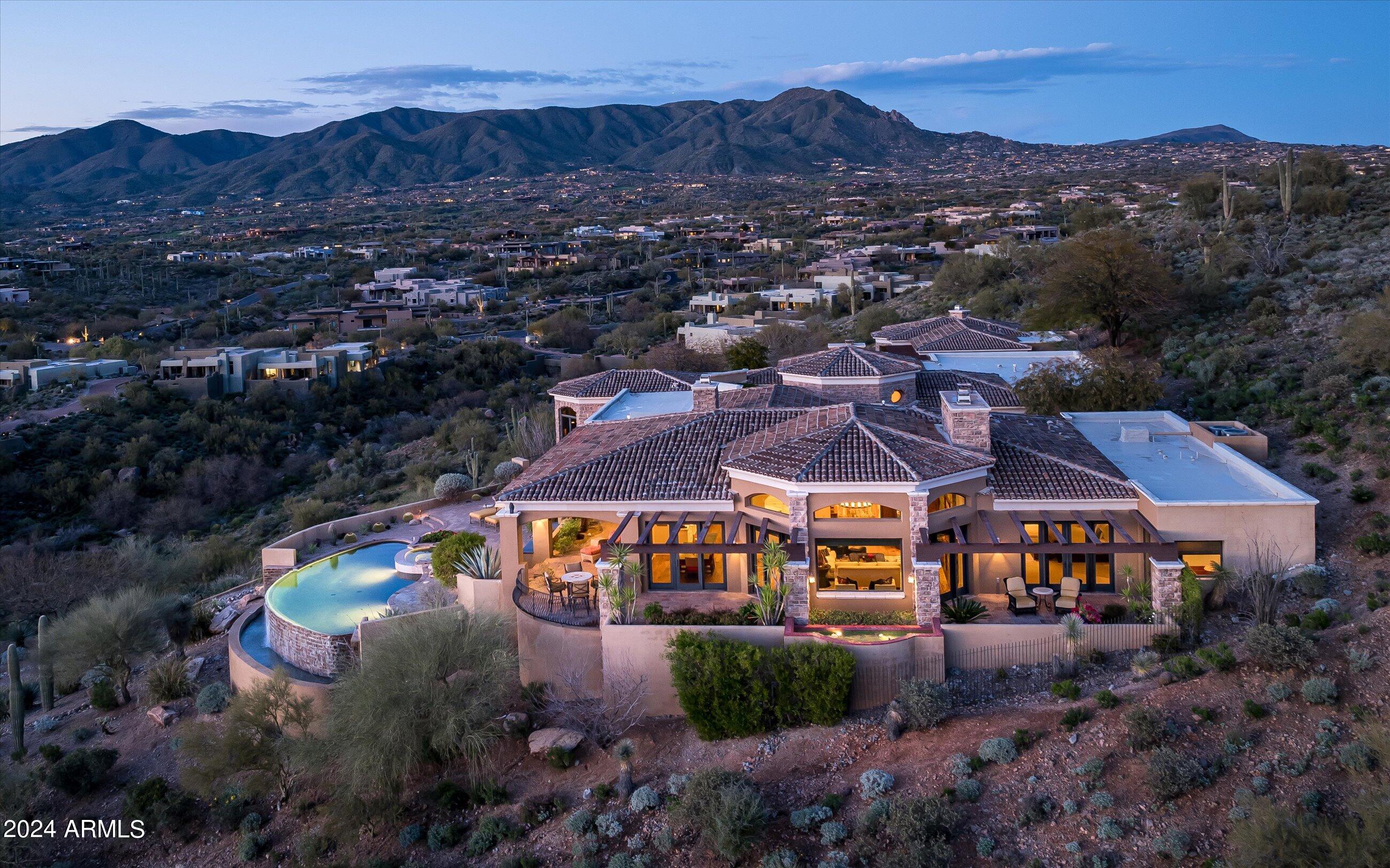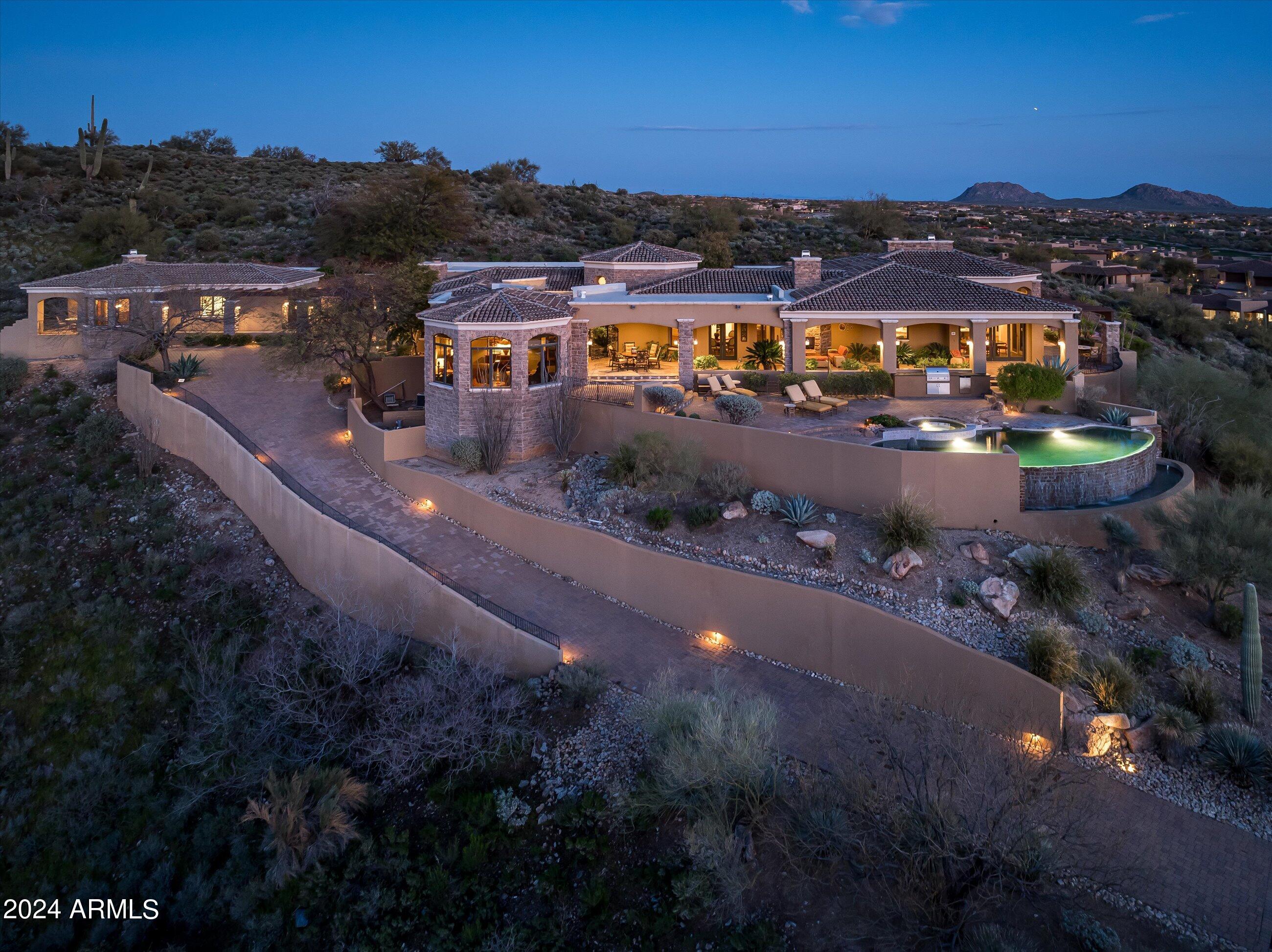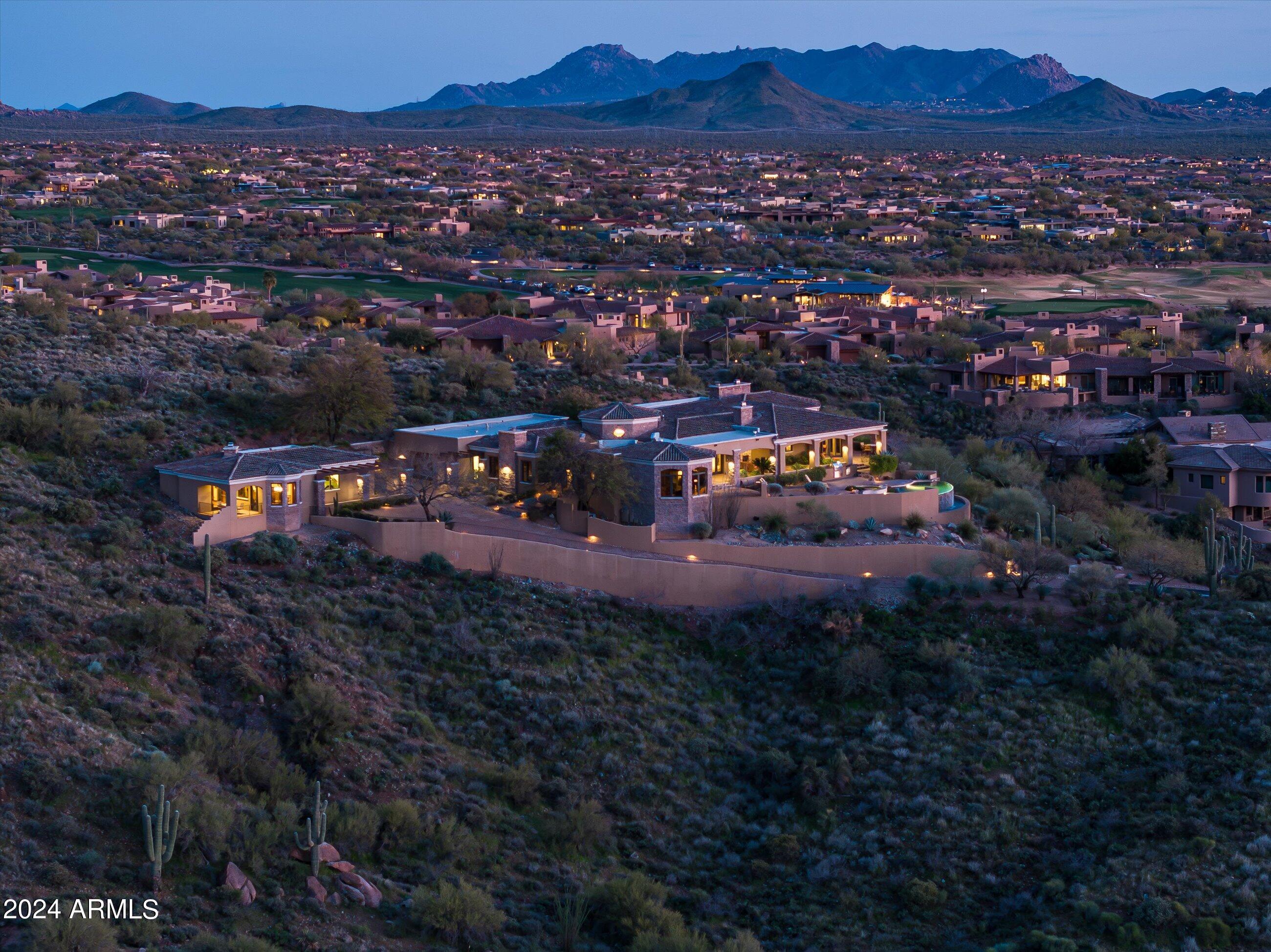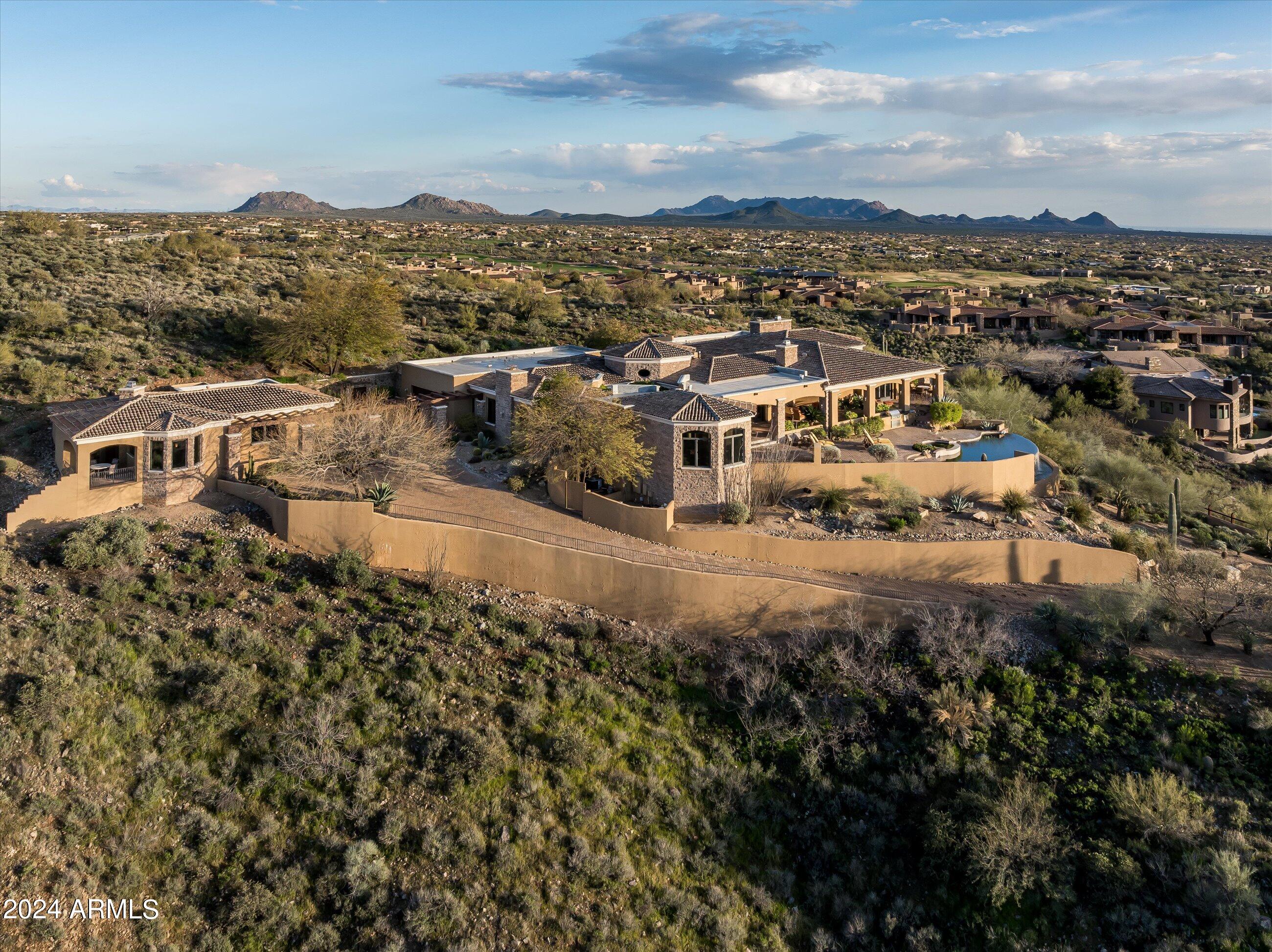 Scenic elevated ~10 acre Santa Barbara estate with breathtaking views of the Valley of the Sun, fabulous Sunsets and City Light Views can be yours forever. This home features 2 separate Guest Houses, 4 car garage, Great Room, Media Room, 2 offices, wet bar, wine room, and 5 En-suite Bedrooms all on 1 level + Exercise Room on Lower level. Lushly landscaped patios and grand-view pool deck are graced by 3 sparkling water features and Juliet balcony. Main home 3 En-suite Bedrooms open to interior courtyard w/water feature. Every possibility for seamless, indoor/outdoor living has been thoughtfully designed into this High Sonoran Retreat. Golf Membership available to transfer from Seller and furnishings excluding art are available under separate Bill of Sale.