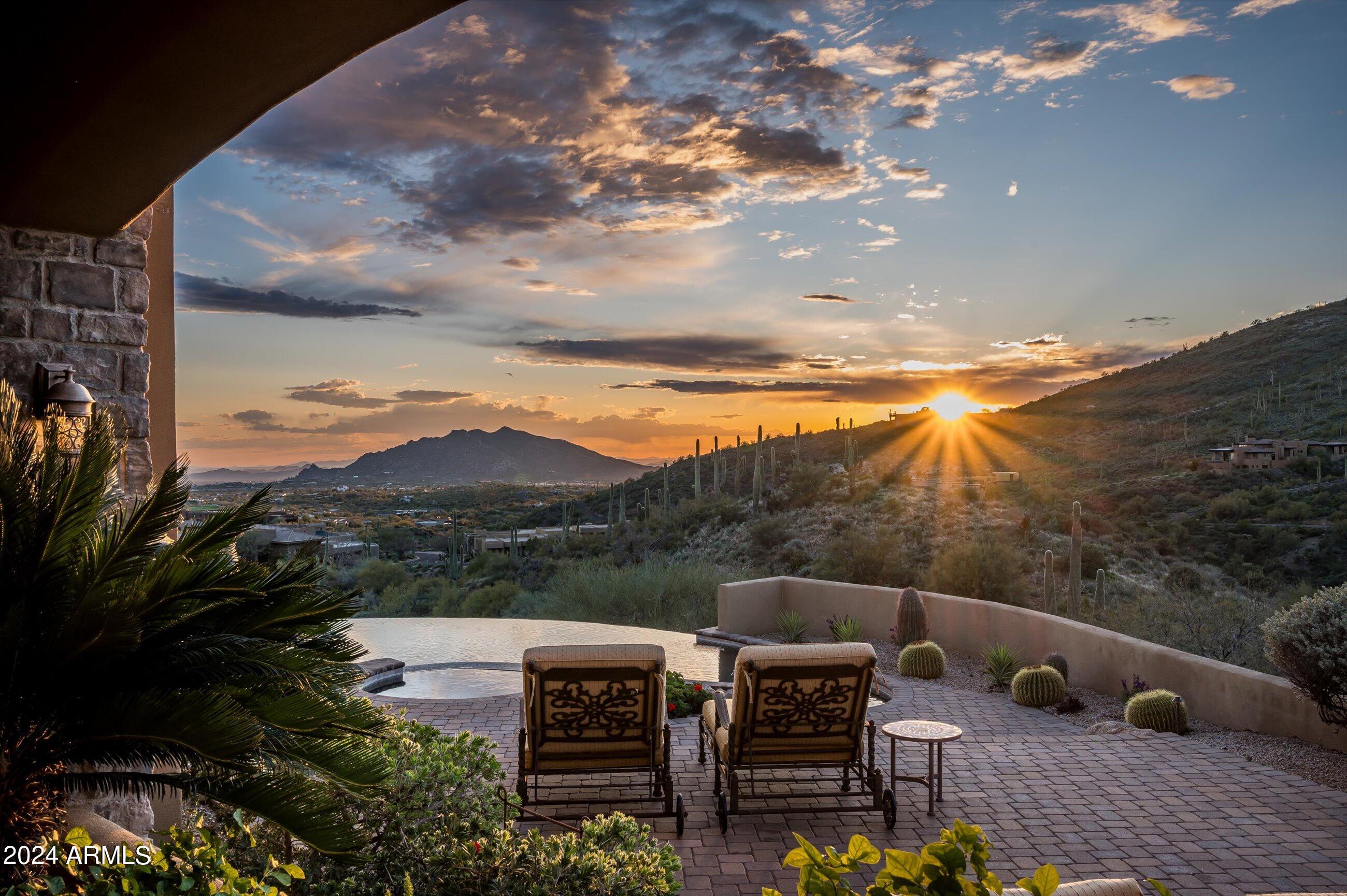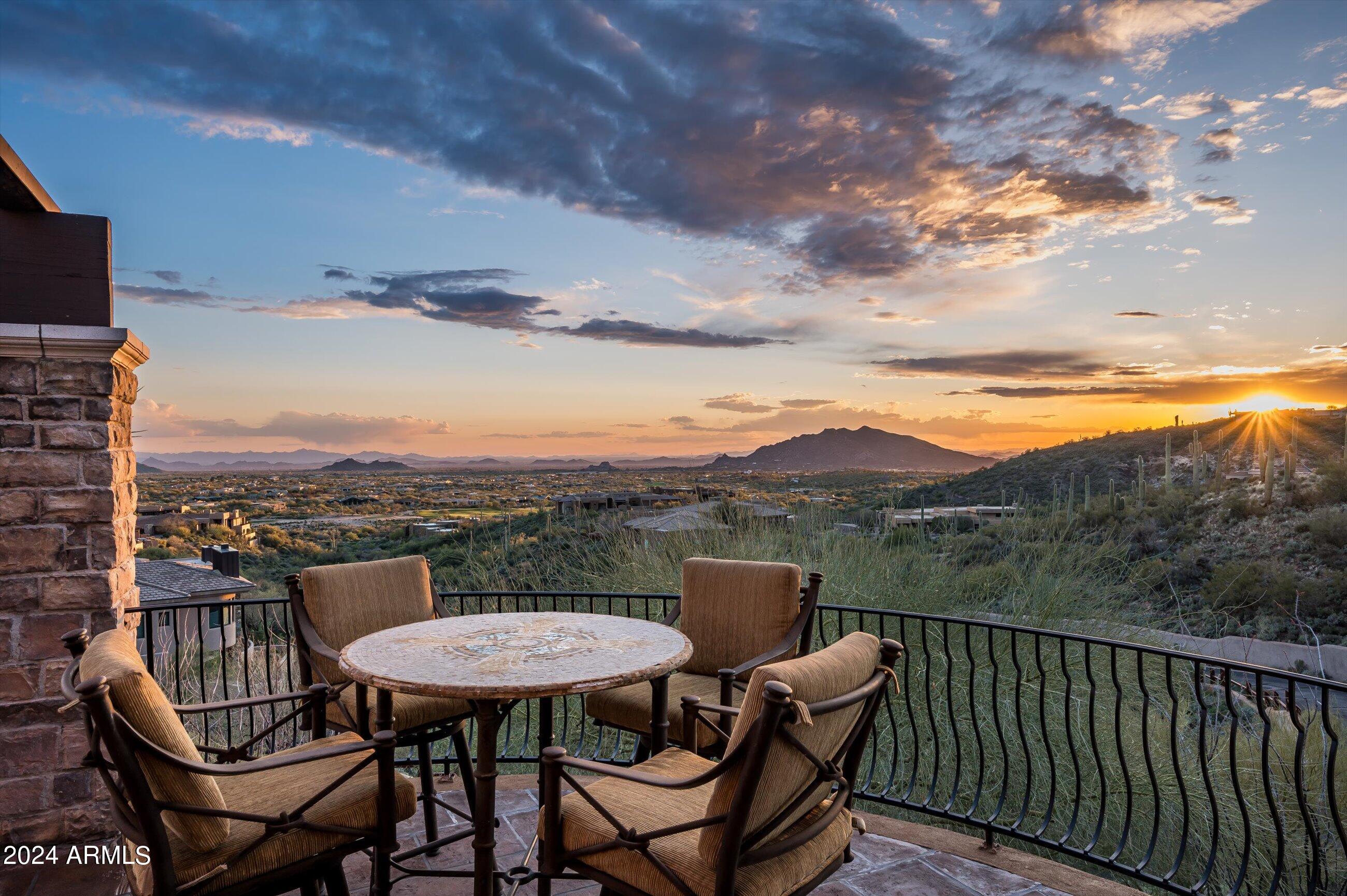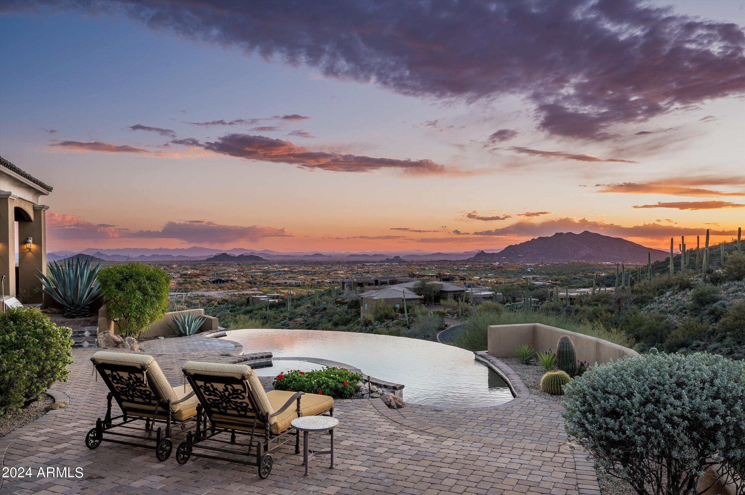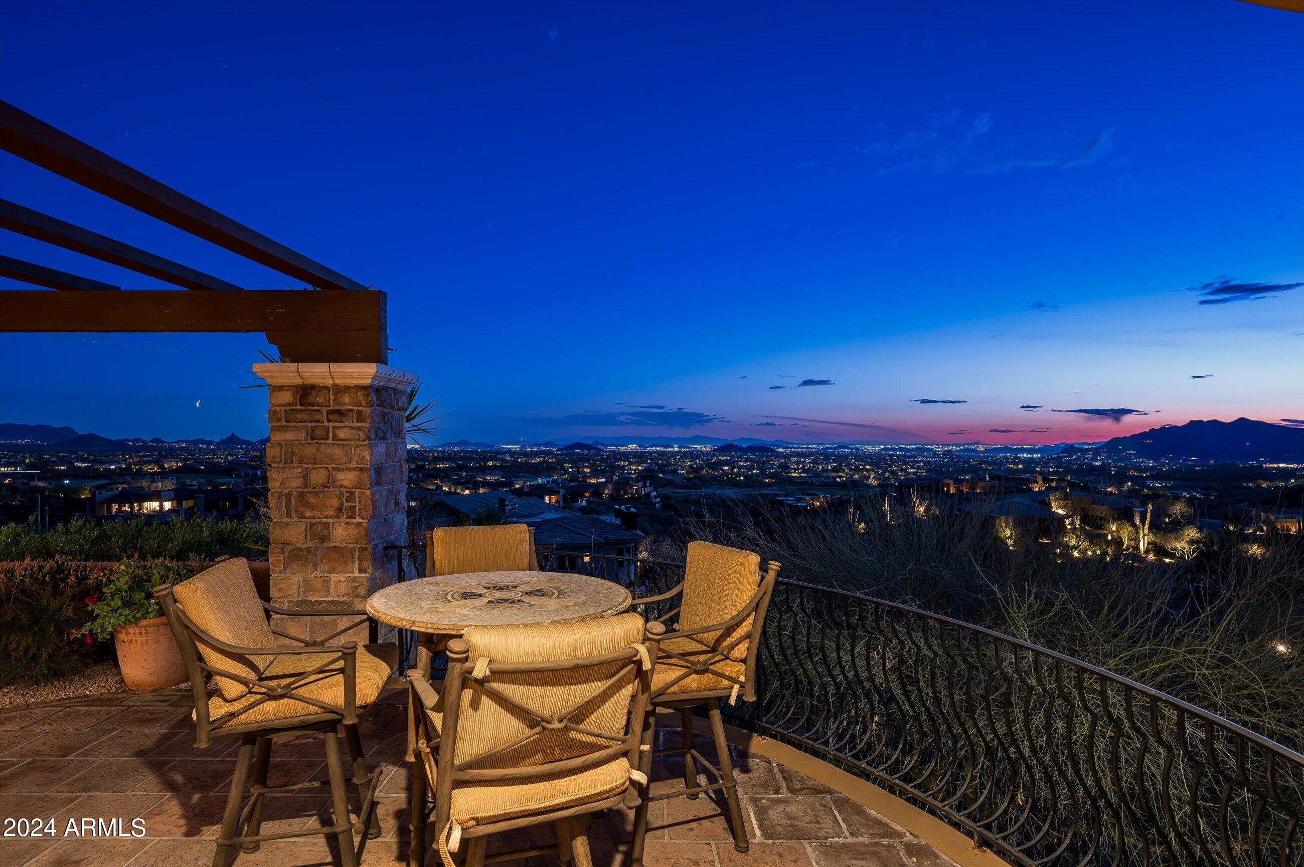 Scenic elevated ~10 acre Santa Barbara estate with breathtaking views of the Valley of the Sun, fabulous Sunsets and City Light Views can be yours forever. This home features 2 separate Guest Houses, 4 car garage, Great Room, Media Room, 2 offices, wet bar, wine room, and 5 En-suite Bedrooms all on 1 level + Exercise Room on Lower level. Lushly landscaped patios and grand-view pool deck are graced by 3 sparkling water features and Juliet balcony. Main home 3 En-suite Bedrooms open to interior courtyard w/water feature. Every possibility for seamless, indoor/outdoor living has been thoughtfully designed into this High Sonoran Retreat. Golf Membership available to transfer from Seller and furnishings excluding art are available under separate Bill of Sale.
