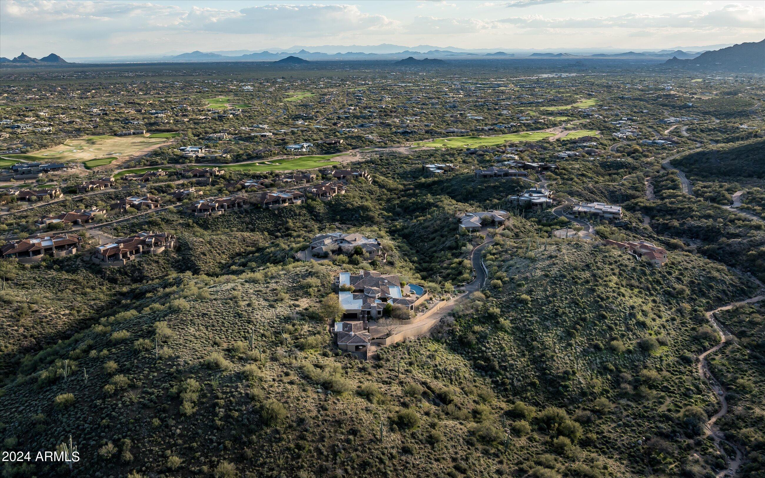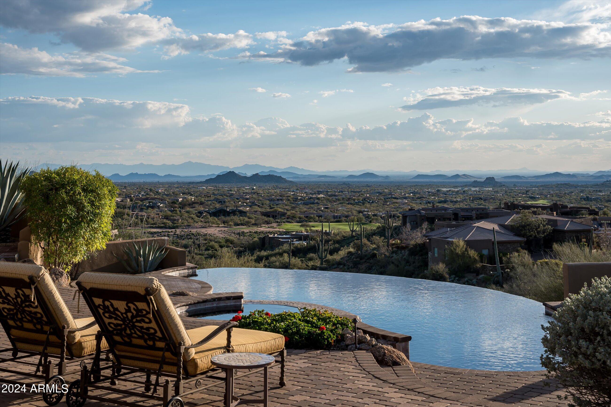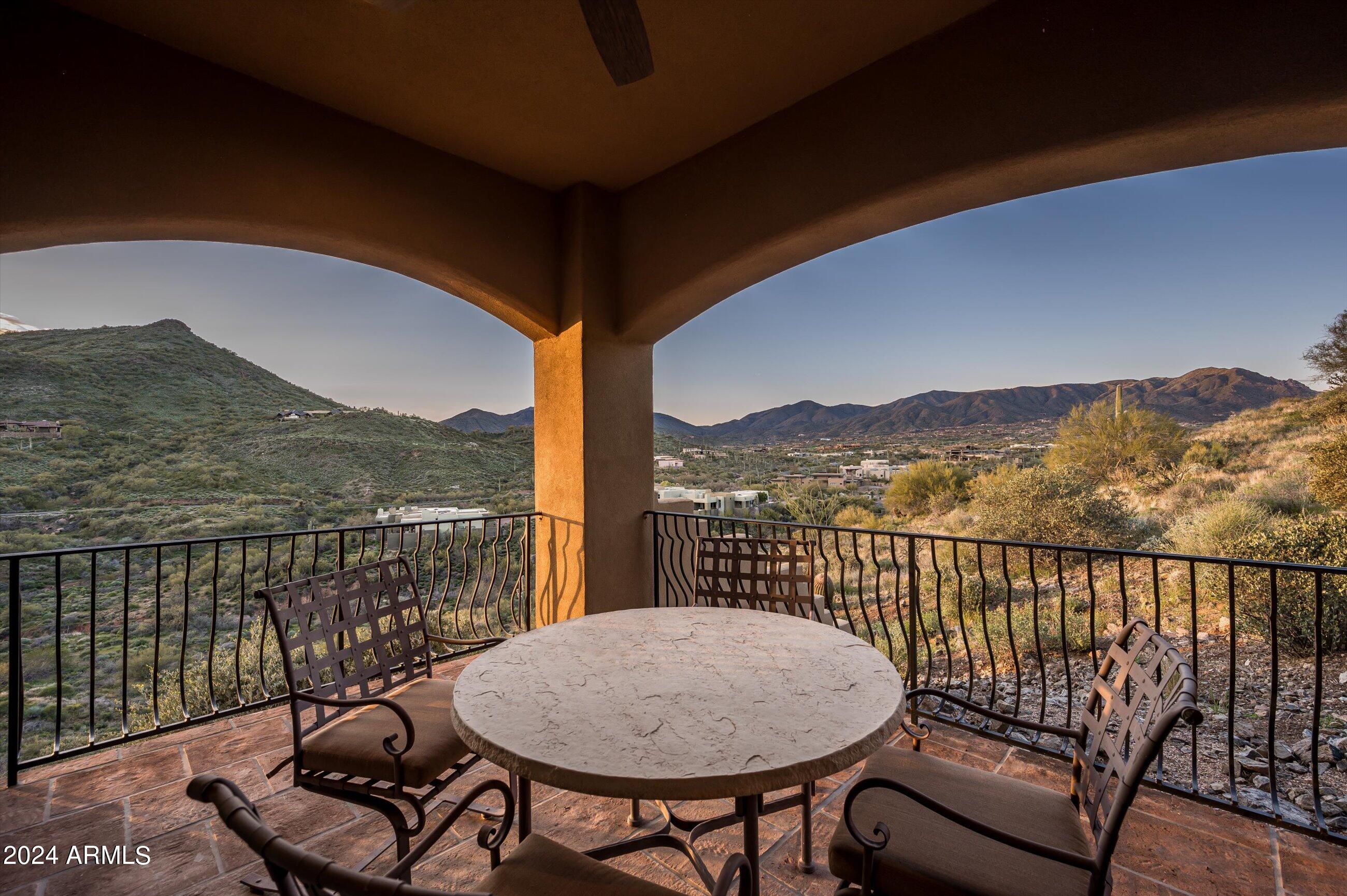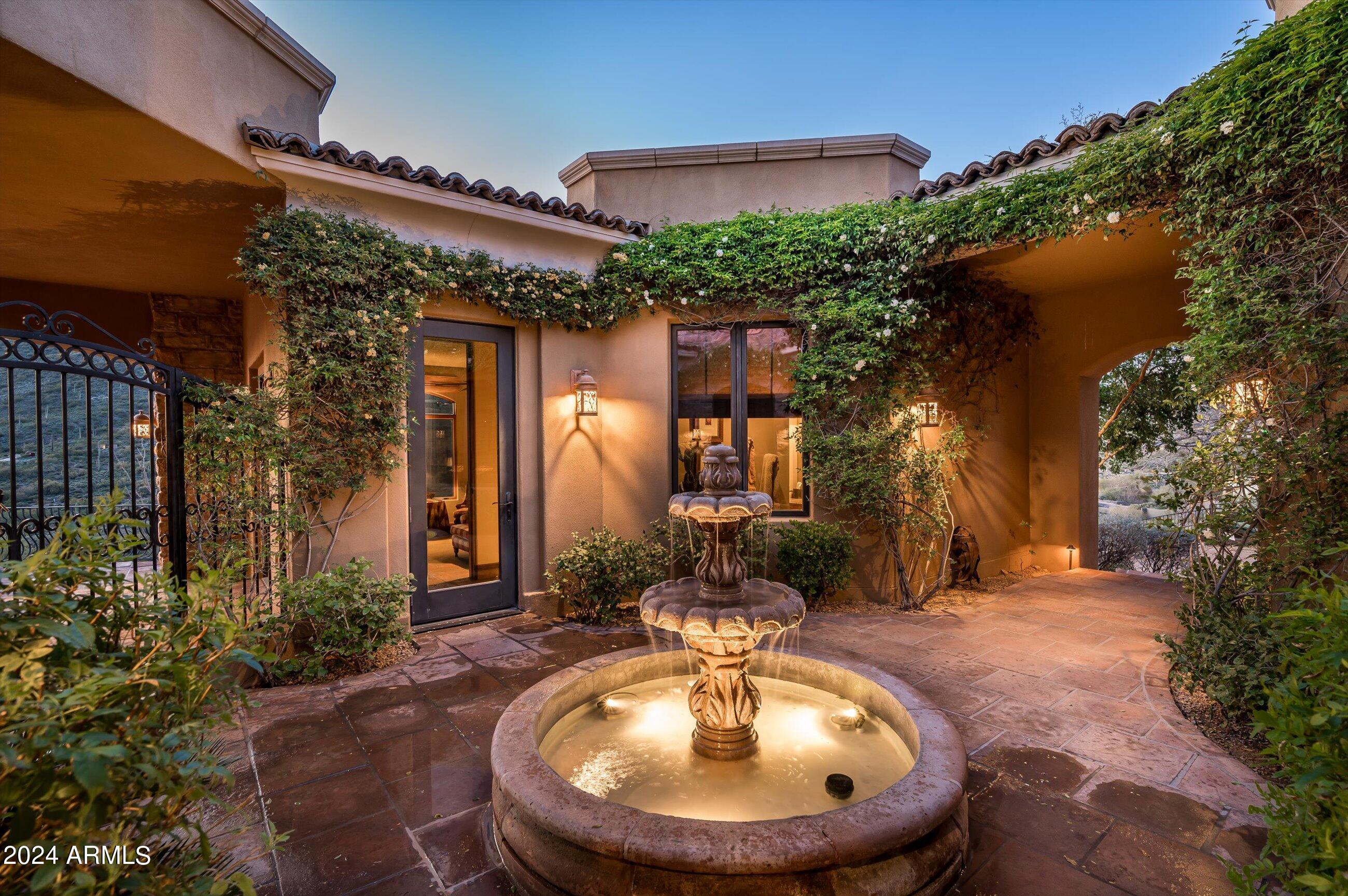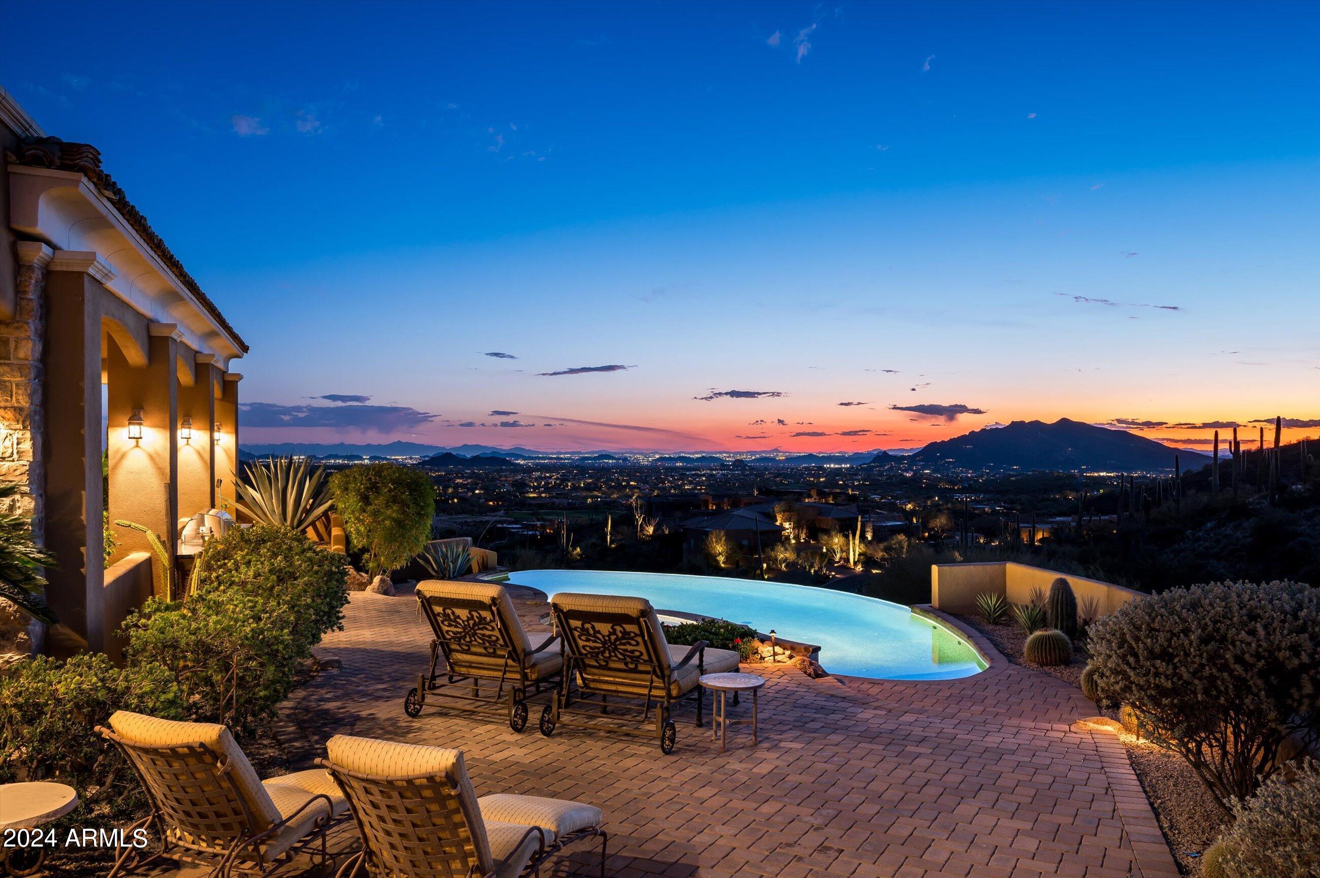 Scenic elevated ~10 acre Santa Barbara estate with breathtaking views of the Valley of the Sun, fabulous Sunsets and City Light Views can be yours forever. This home features 2 separate Guest Houses, 4 car garage, Great Room, Media Room, 2 offices, wet bar, wine room, and 5 En-suite Bedrooms all on 1 level + Exercise Room on Lower level. Lushly landscaped patios and grand-view pool deck are graced by 3 sparkling water features and Juliet balcony. Main home 3 En-suite Bedrooms open to interior courtyard w/water feature. Every possibility for seamless, indoor/outdoor living has been thoughtfully designed into this High Sonoran Retreat. Golf Membership available to transfer from Seller and furnishings excluding art are available under separate Bill of Sale.