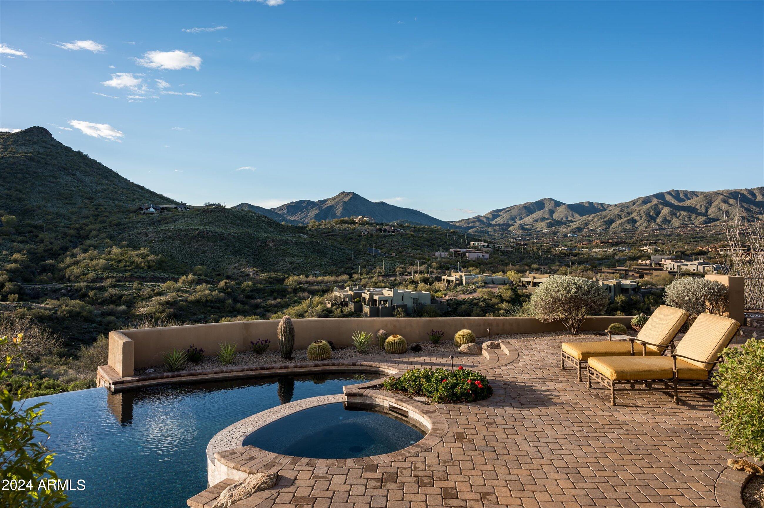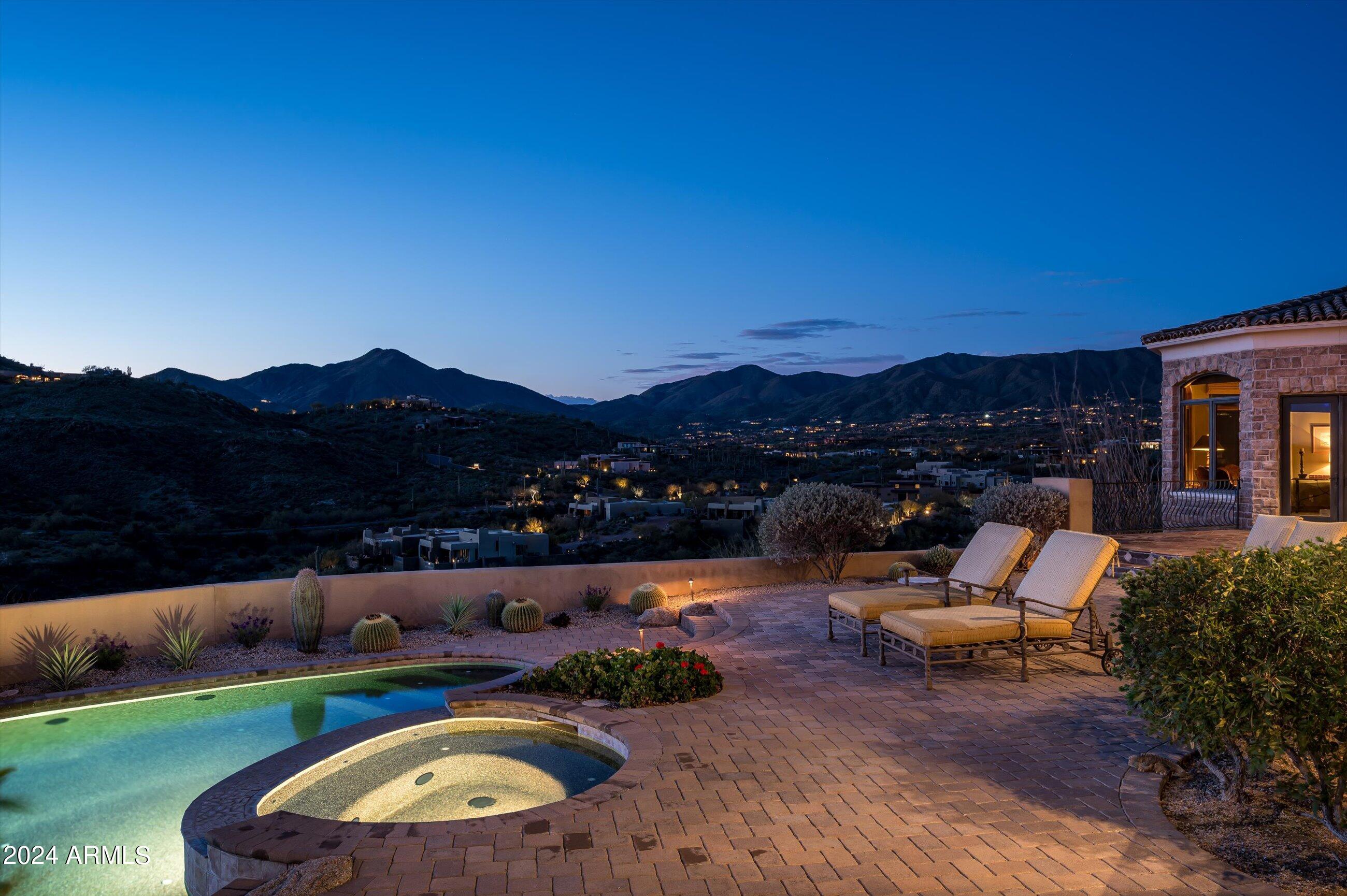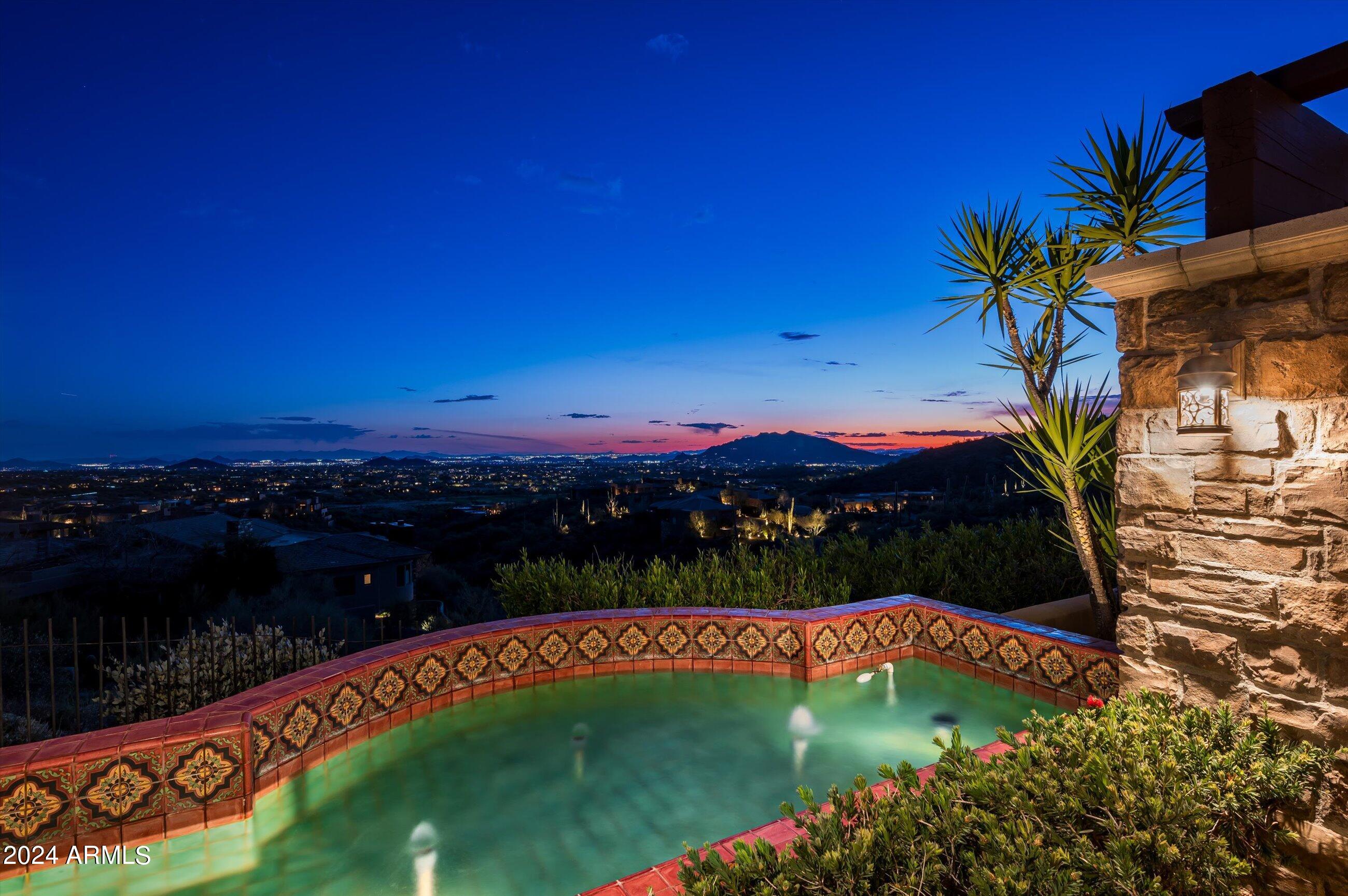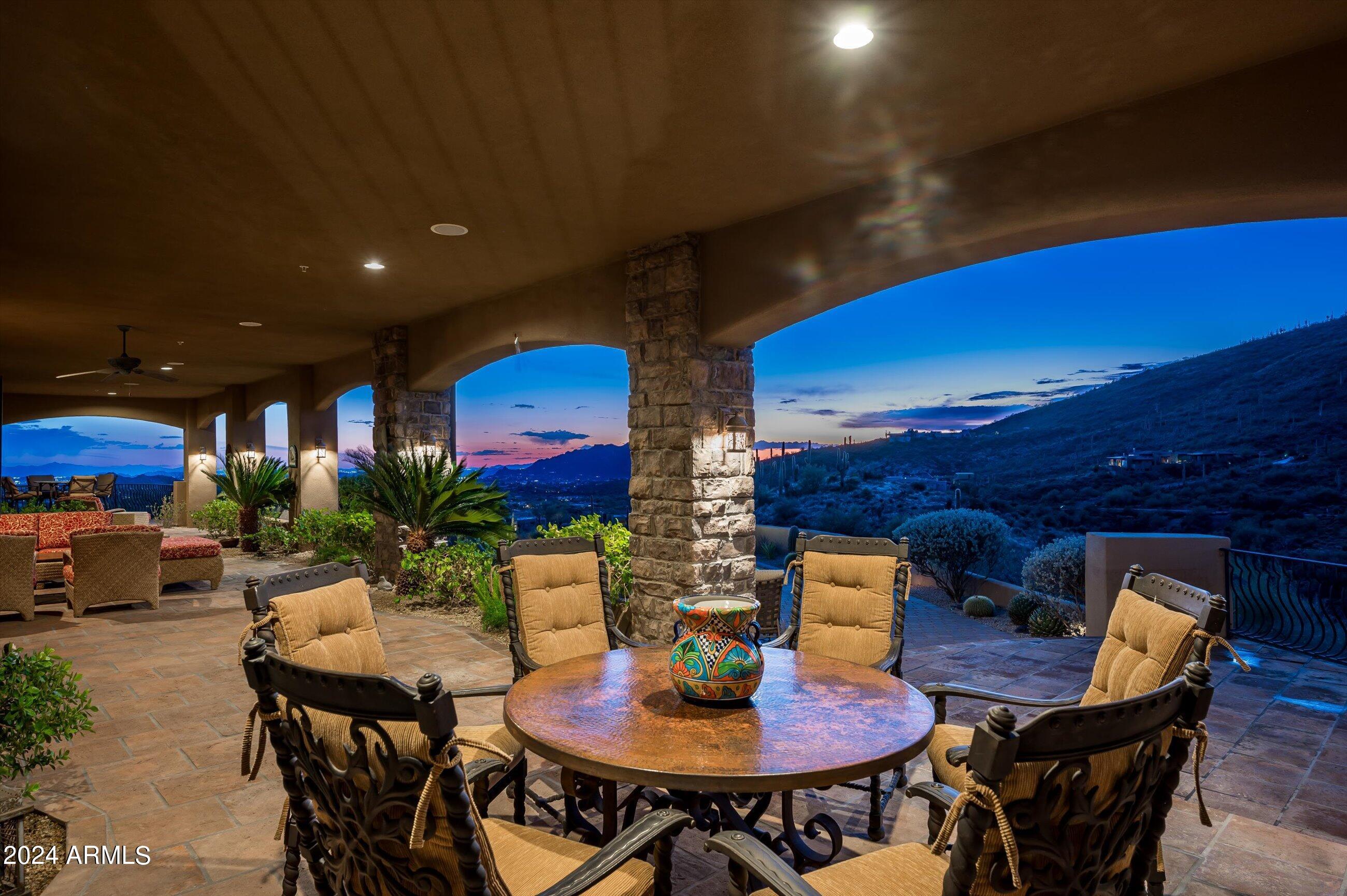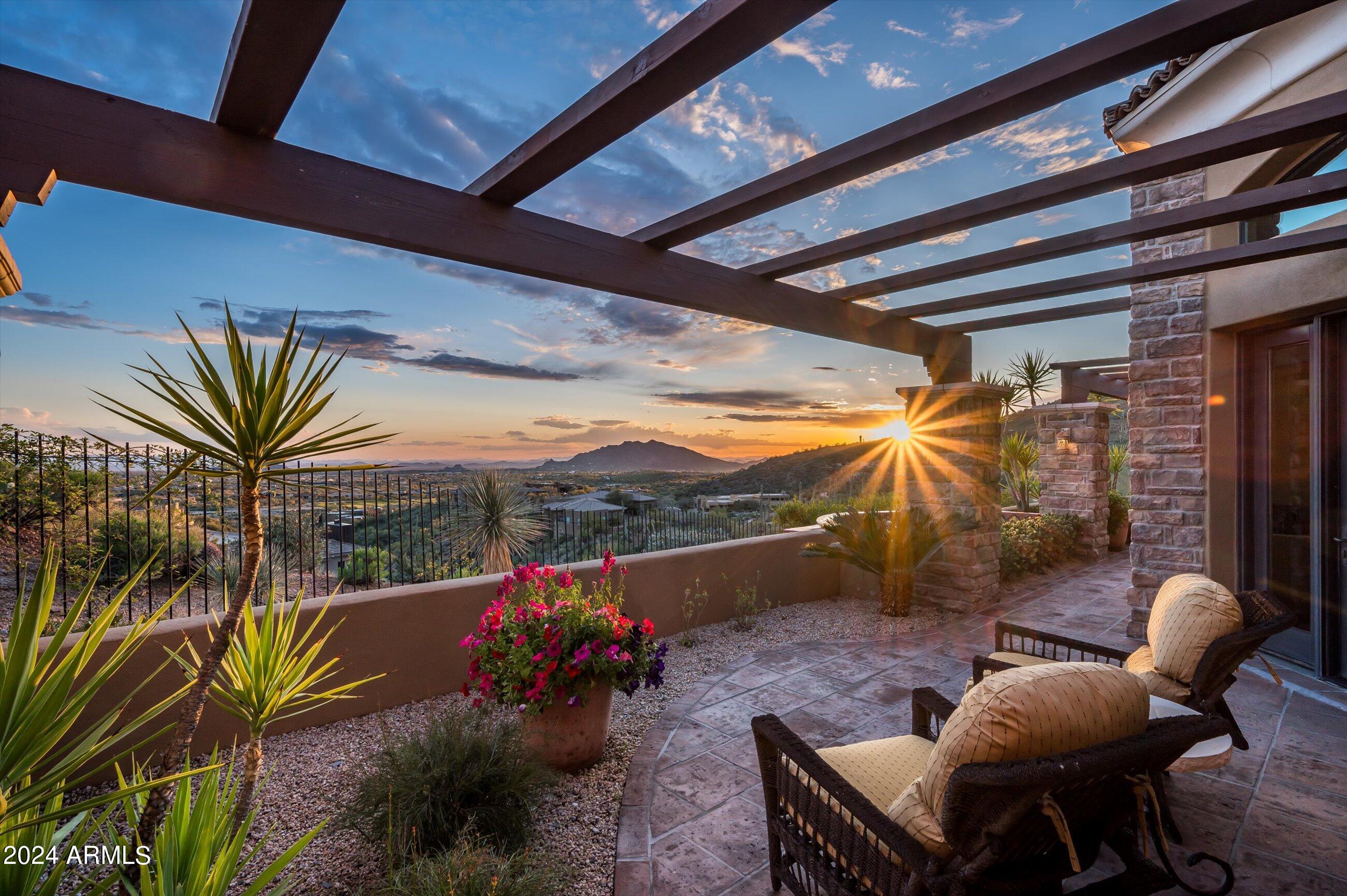 Scenic elevated ~10 acre Santa Barbara estate with breathtaking views of the Valley of the Sun, fabulous Sunsets and City Light Views can be yours forever. This home features 2 separate Guest Houses, 4 car garage, Great Room, Media Room, 2 offices, wet bar, wine room, and 5 En-suite Bedrooms all on 1 level + Exercise Room on Lower level. Lushly landscaped patios and grand-view pool deck are graced by 3 sparkling water features and Juliet balcony. Main home 3 En-suite Bedrooms open to interior courtyard w/water feature. Every possibility for seamless, indoor/outdoor living has been thoughtfully designed into this High Sonoran Retreat. Golf Membership available to transfer from Seller and furnishings excluding art are available under separate Bill of Sale.