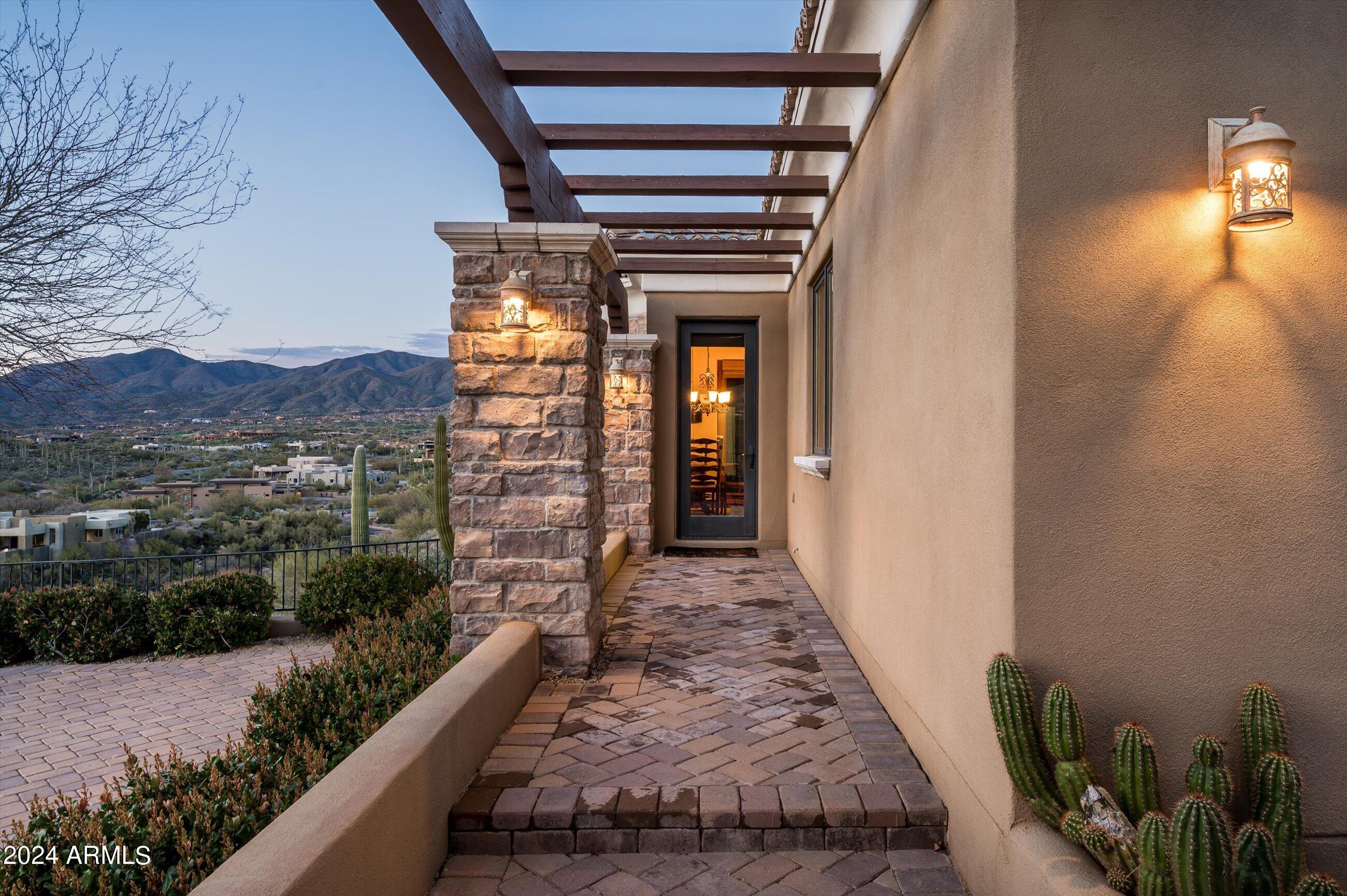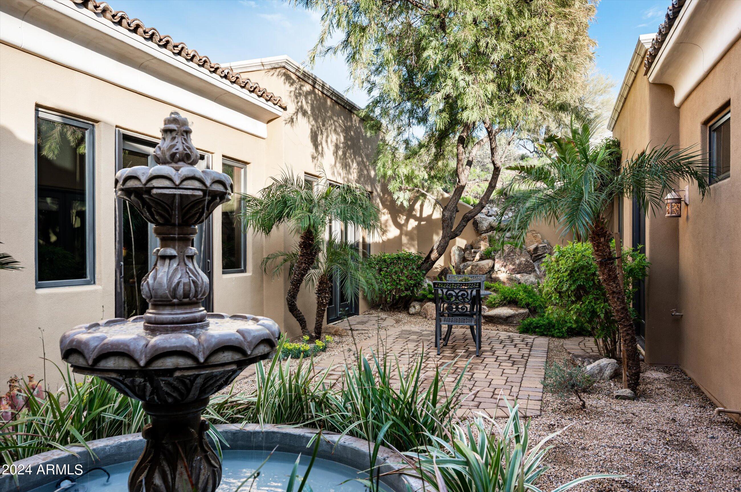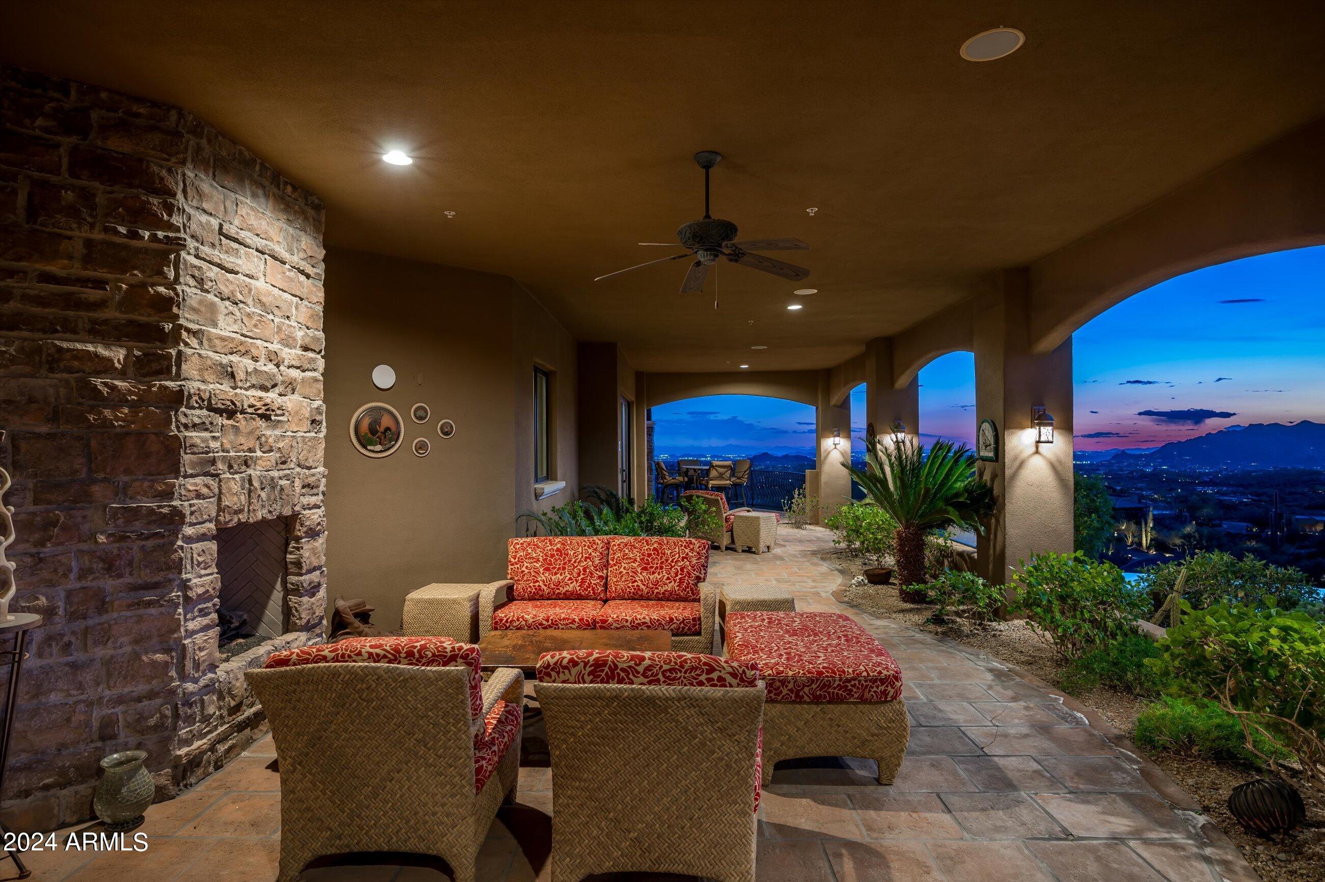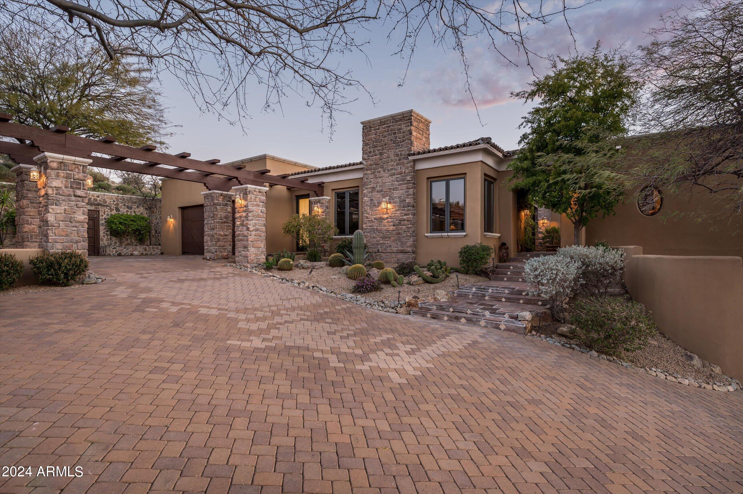 Scenic elevated ~10 acre Santa Barbara estate with breathtaking views of the Valley of the Sun, fabulous Sunsets and City Light Views can be yours forever. This home features 2 separate Guest Houses, 4 car garage, Great Room, Media Room, 2 offices, wet bar, wine room, and 5 En-suite Bedrooms all on 1 level + Exercise Room on Lower level. Lushly landscaped patios and grand-view pool deck are graced by 3 sparkling water features and Juliet balcony. Main home 3 En-suite Bedrooms open to interior courtyard w/water feature. Every possibility for seamless, indoor/outdoor living has been thoughtfully designed into this High Sonoran Retreat. Golf Membership available to transfer from Seller and furnishings excluding art are available under separate Bill of Sale.