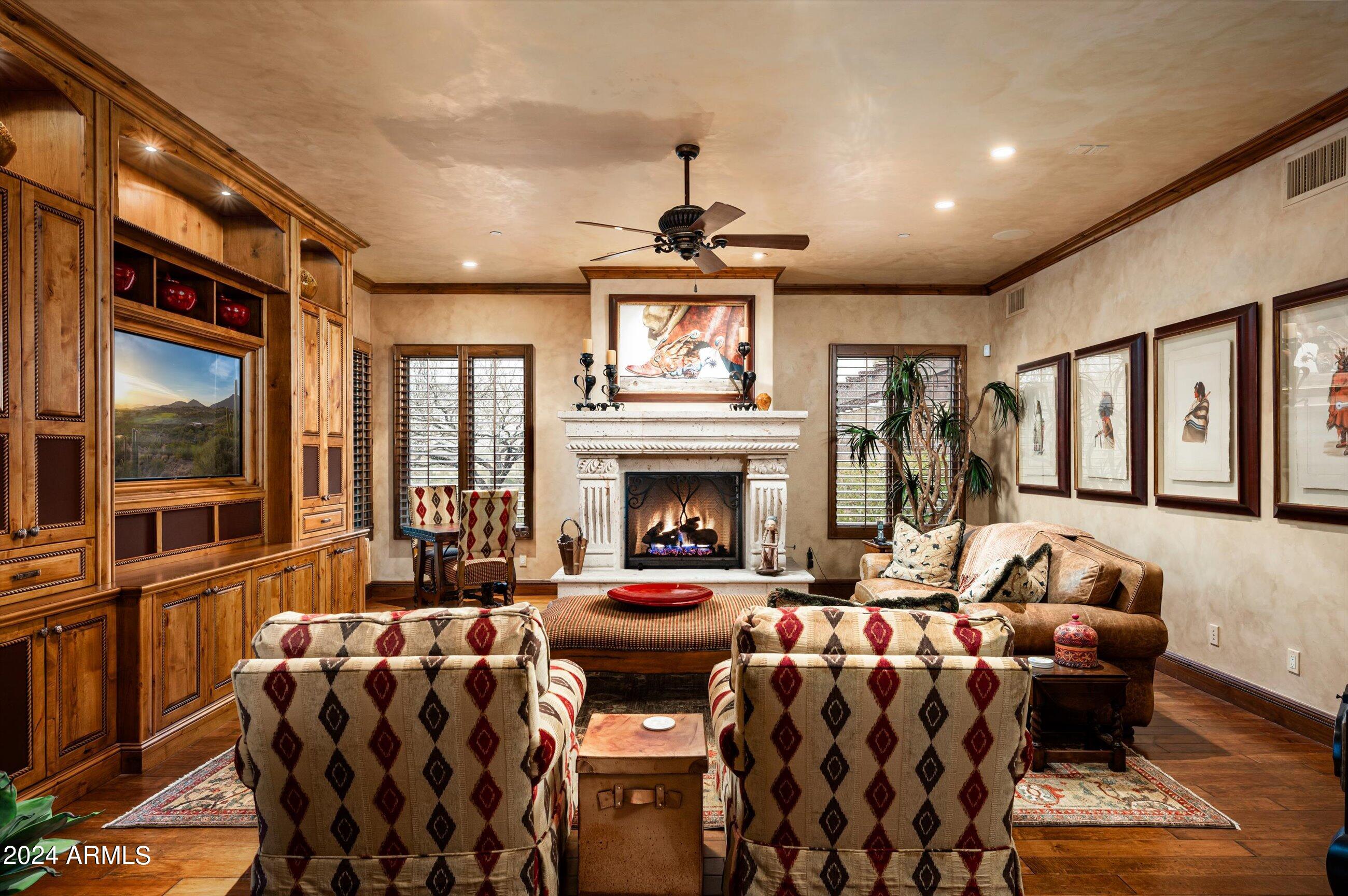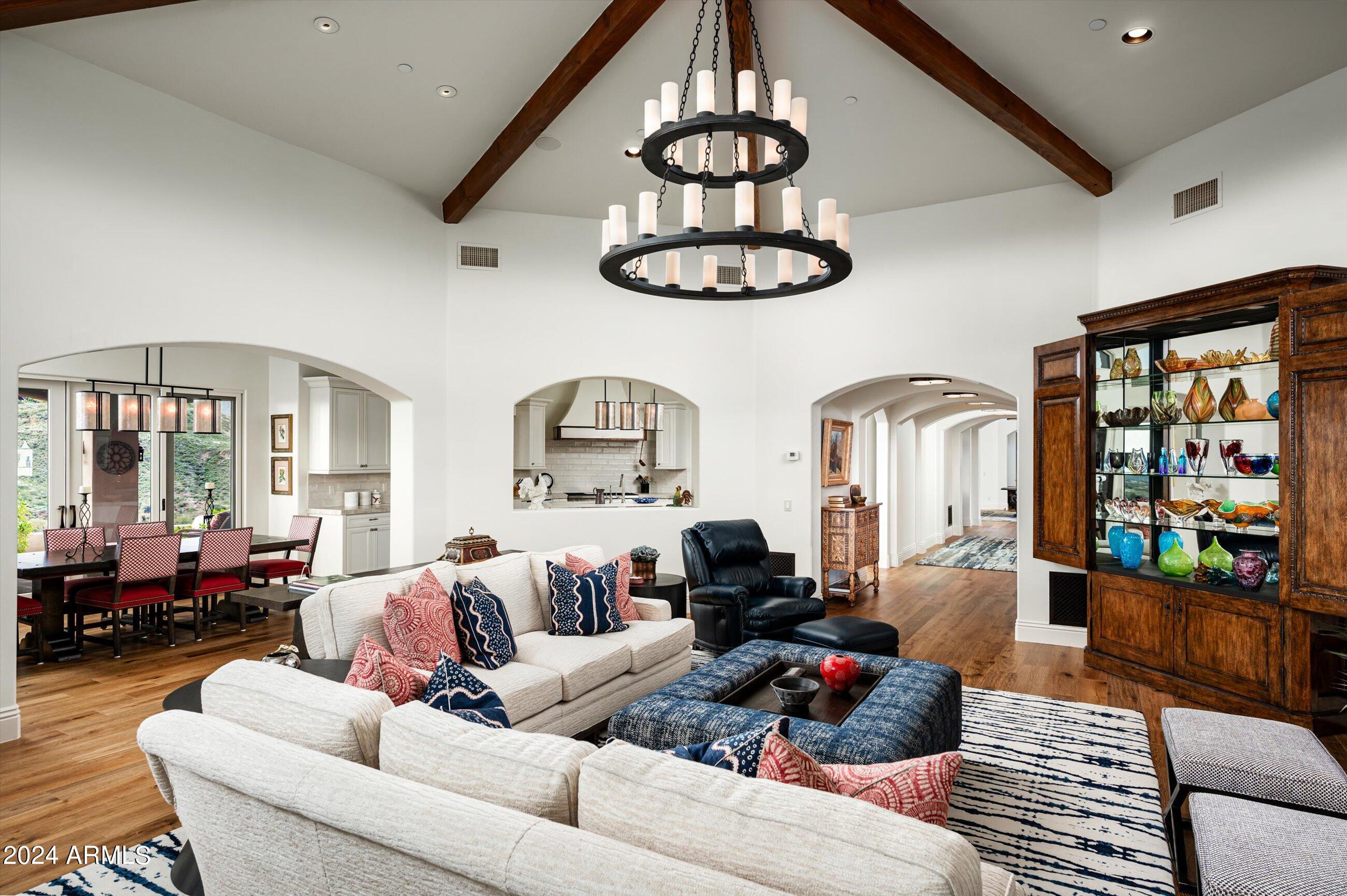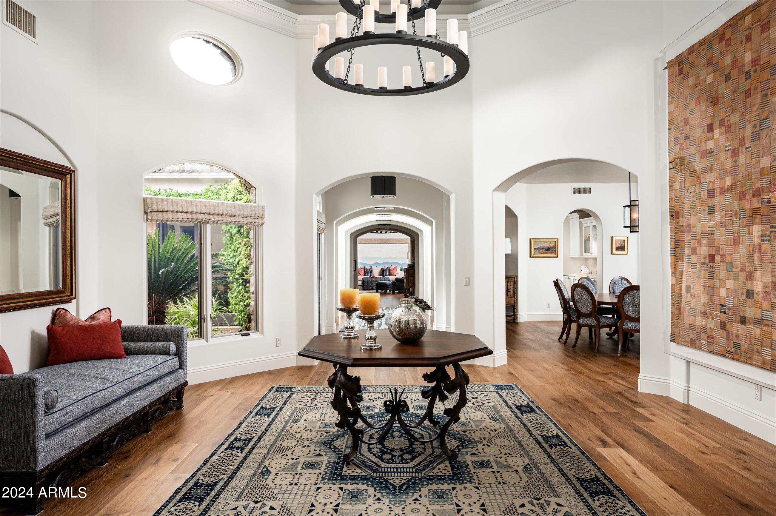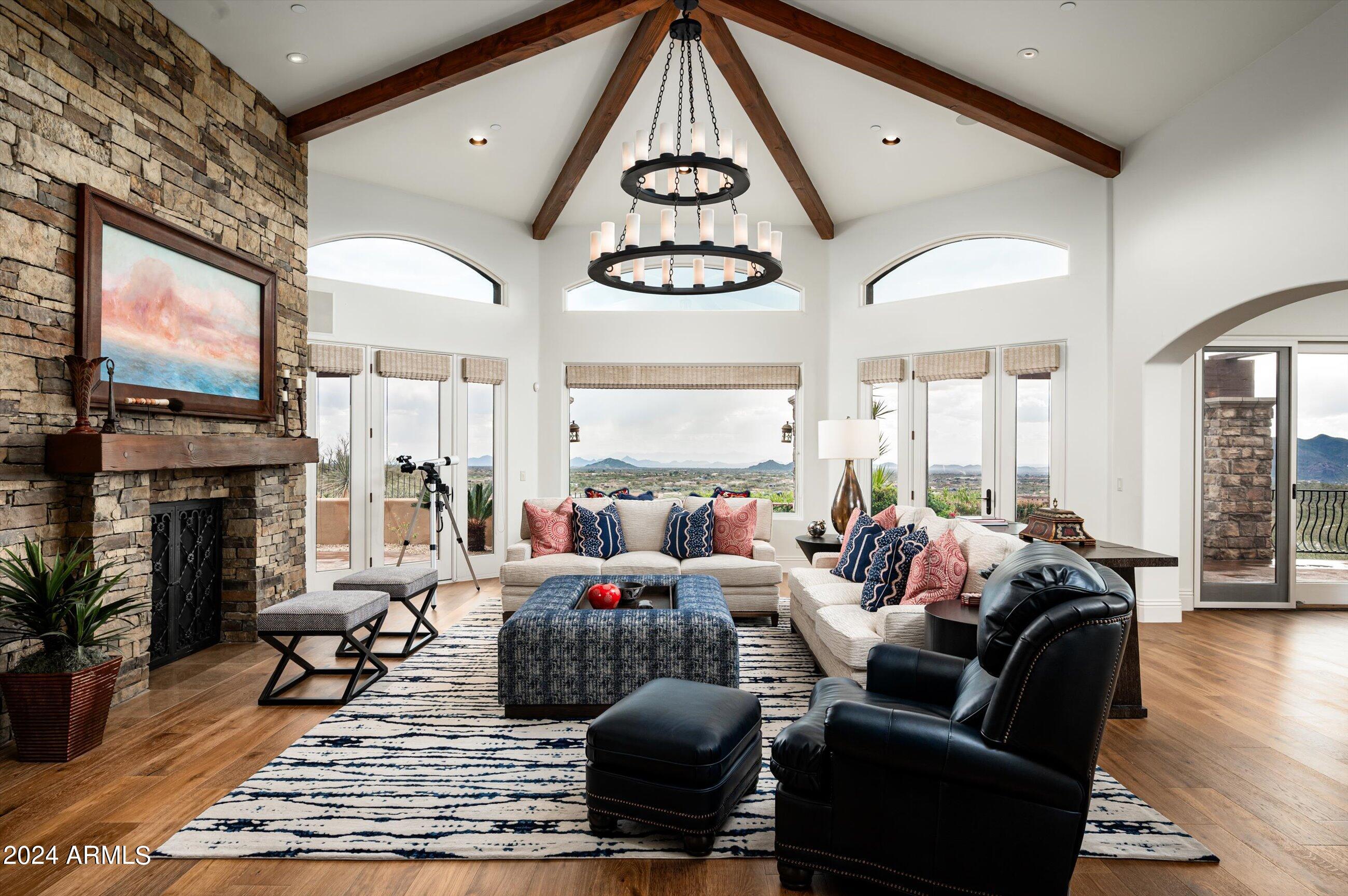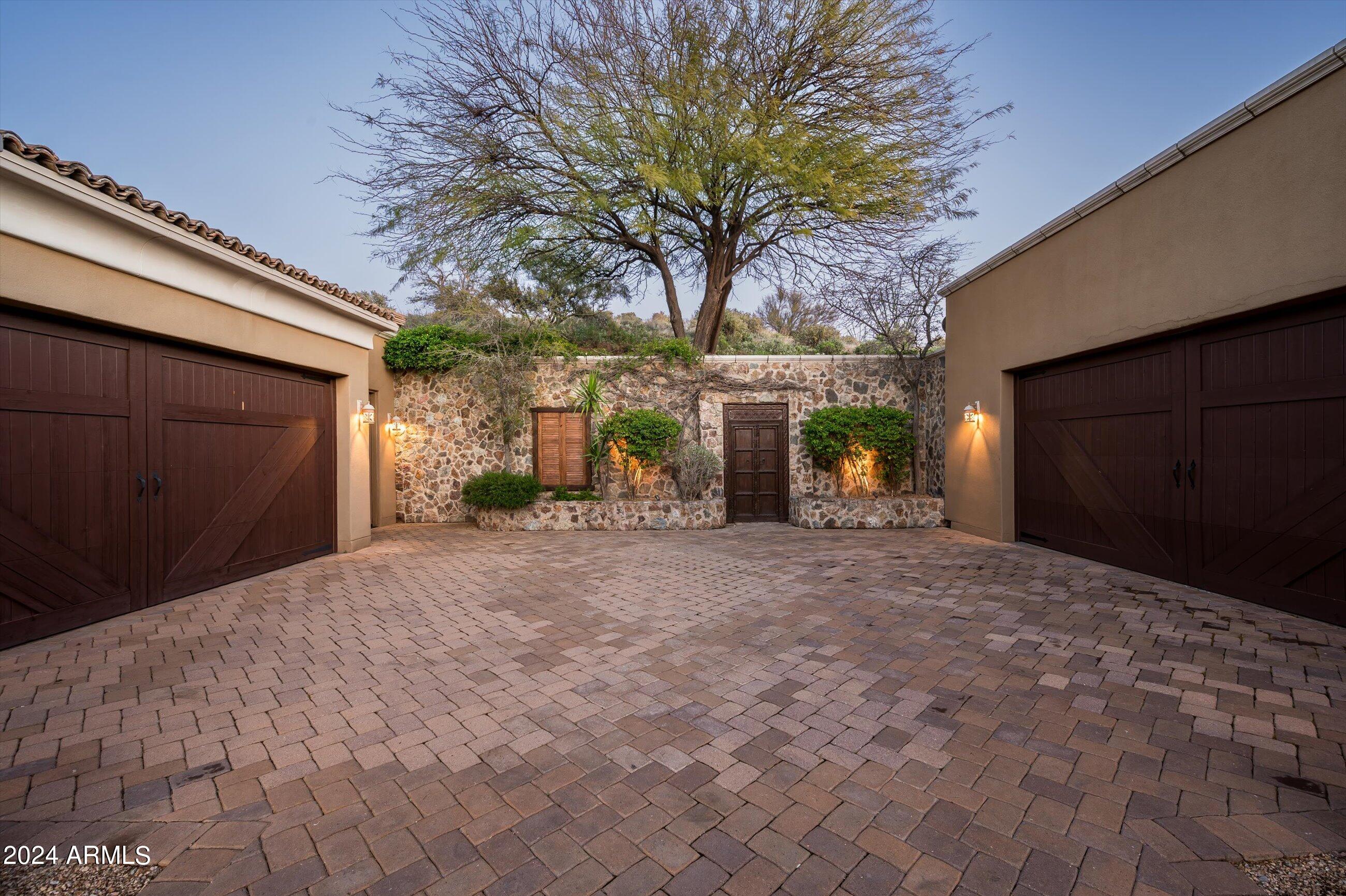 Scenic elevated ~10 acre Santa Barbara estate with breathtaking views of the Valley of the Sun, fabulous Sunsets and City Light Views can be yours forever. This home features 2 separate Guest Houses, 4 car garage, Great Room, Media Room, 2 offices, wet bar, wine room, and 5 En-suite Bedrooms all on 1 level + Exercise Room on Lower level. Lushly landscaped patios and grand-view pool deck are graced by 3 sparkling water features and Juliet balcony. Main home 3 En-suite Bedrooms open to interior courtyard w/water feature. Every possibility for seamless, indoor/outdoor living has been thoughtfully designed into this High Sonoran Retreat. Golf Membership available to transfer from Seller and furnishings excluding art are available under separate Bill of Sale.