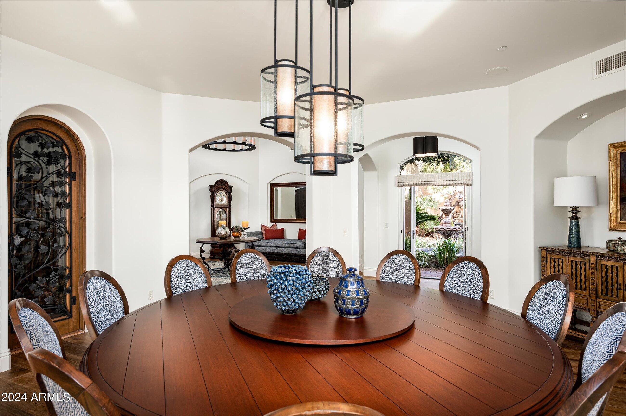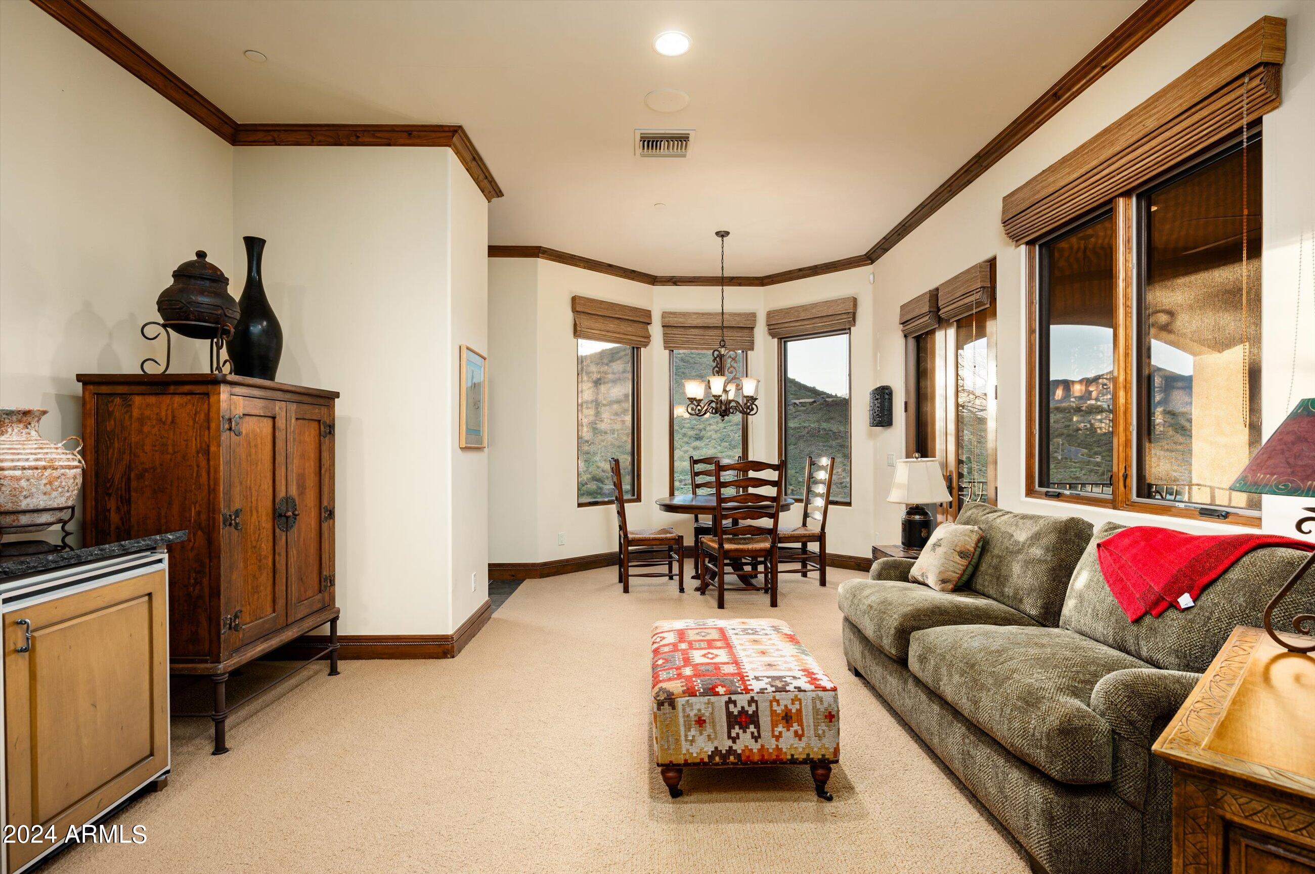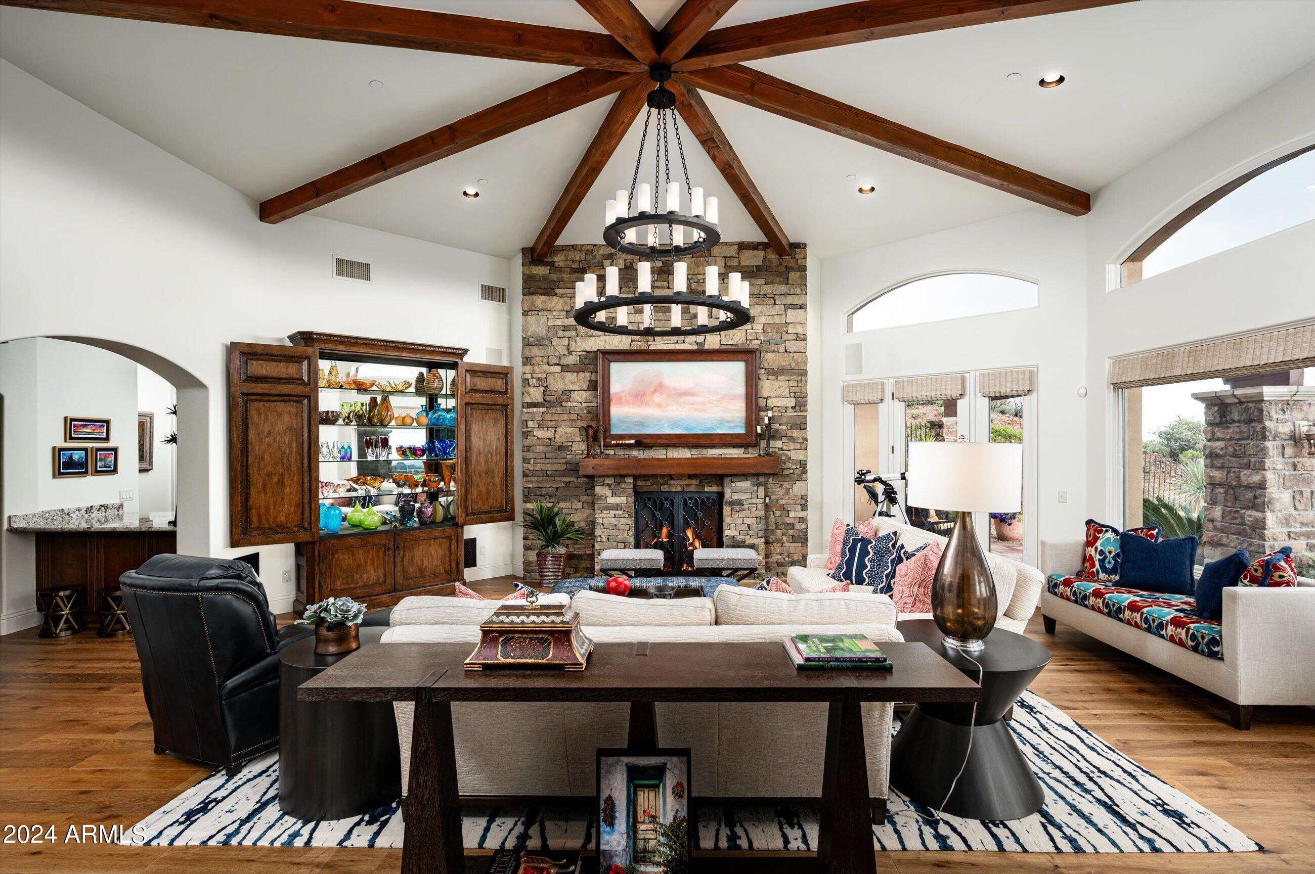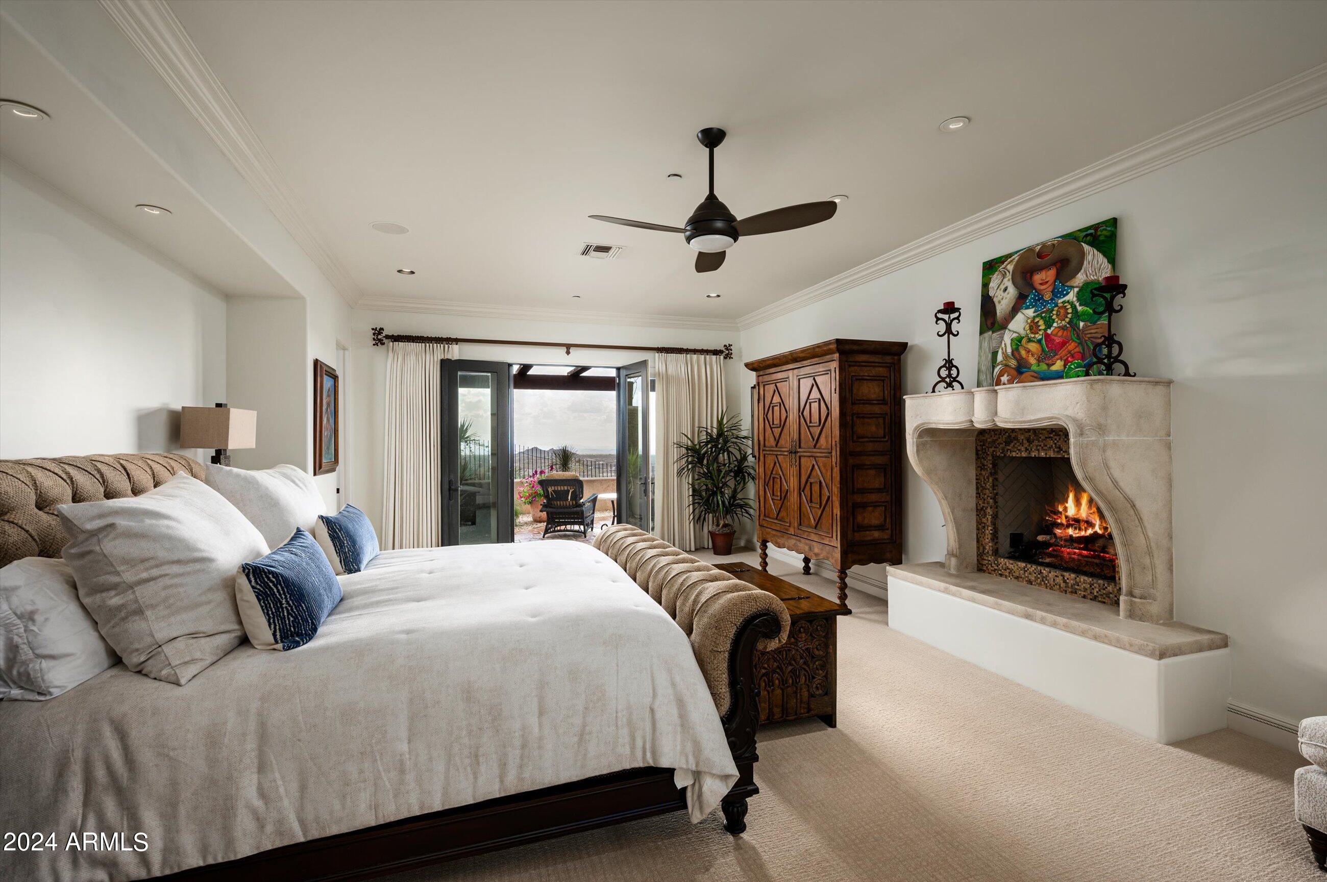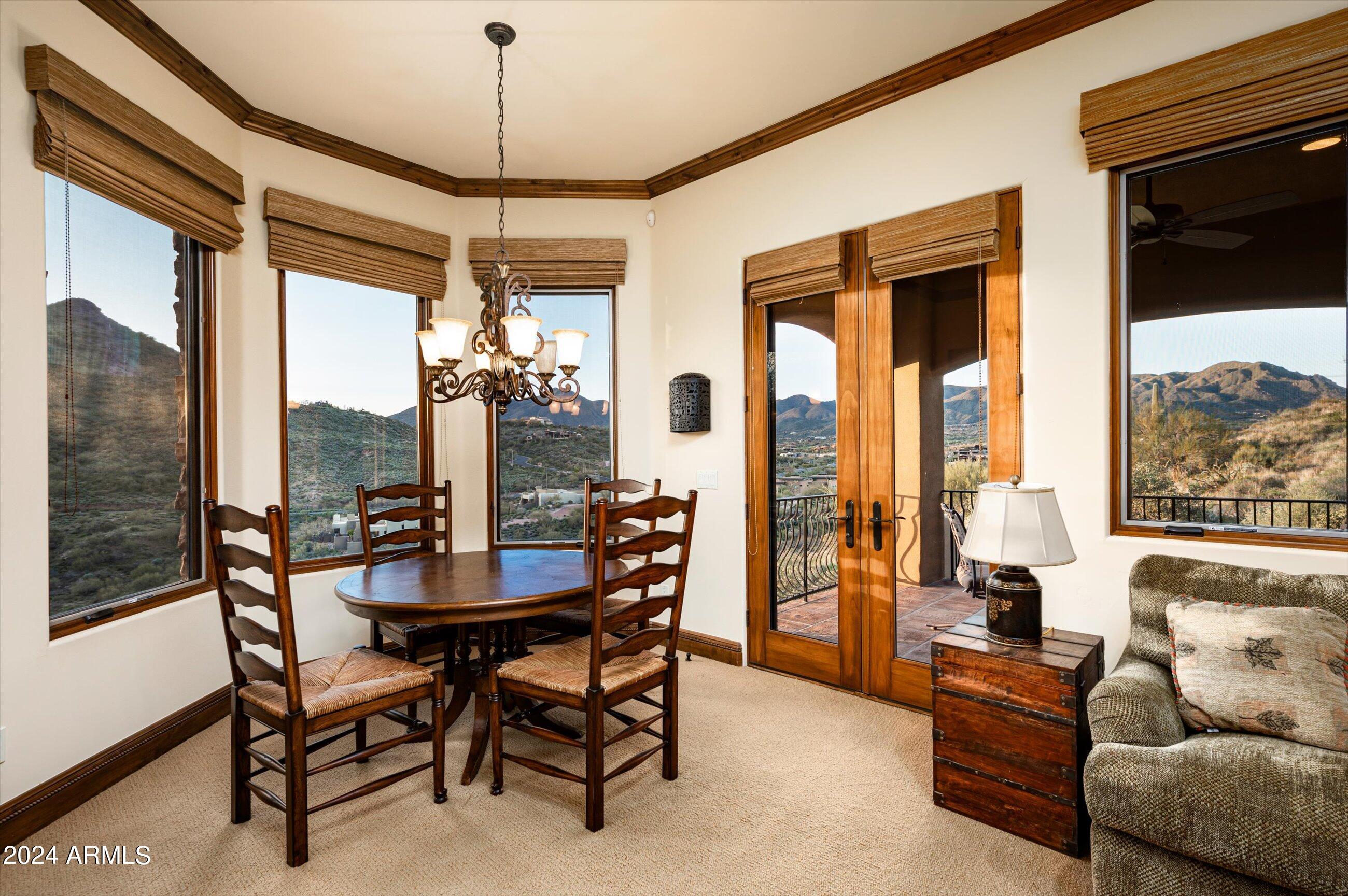 Scenic elevated ~10 acre Santa Barbara estate with breathtaking views of the Valley of the Sun, fabulous Sunsets and City Light Views can be yours forever. This home features 2 separate Guest Houses, 4 car garage, Great Room, Media Room, 2 offices, wet bar, wine room, and 5 En-suite Bedrooms all on 1 level + Exercise Room on Lower level. Lushly landscaped patios and grand-view pool deck are graced by 3 sparkling water features and Juliet balcony. Main home 3 En-suite Bedrooms open to interior courtyard w/water feature. Every possibility for seamless, indoor/outdoor living has been thoughtfully designed into this High Sonoran Retreat. Golf Membership available to transfer from Seller and furnishings excluding art are available under separate Bill of Sale.