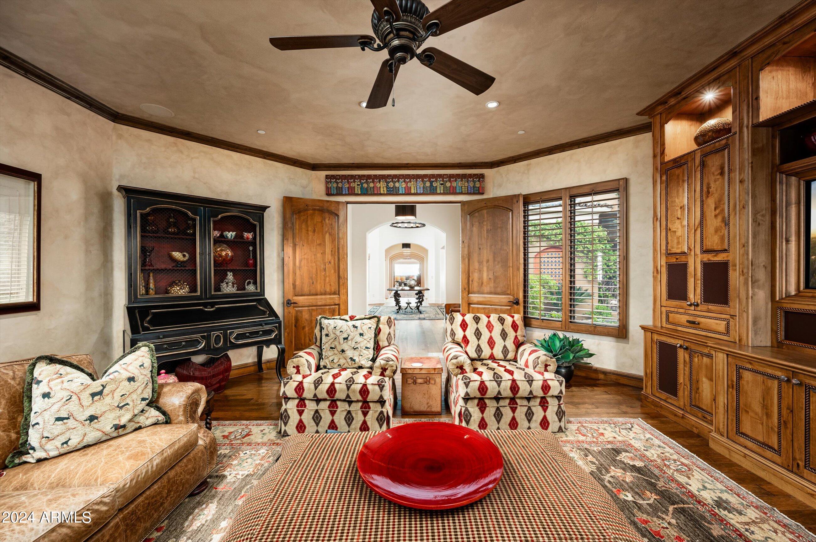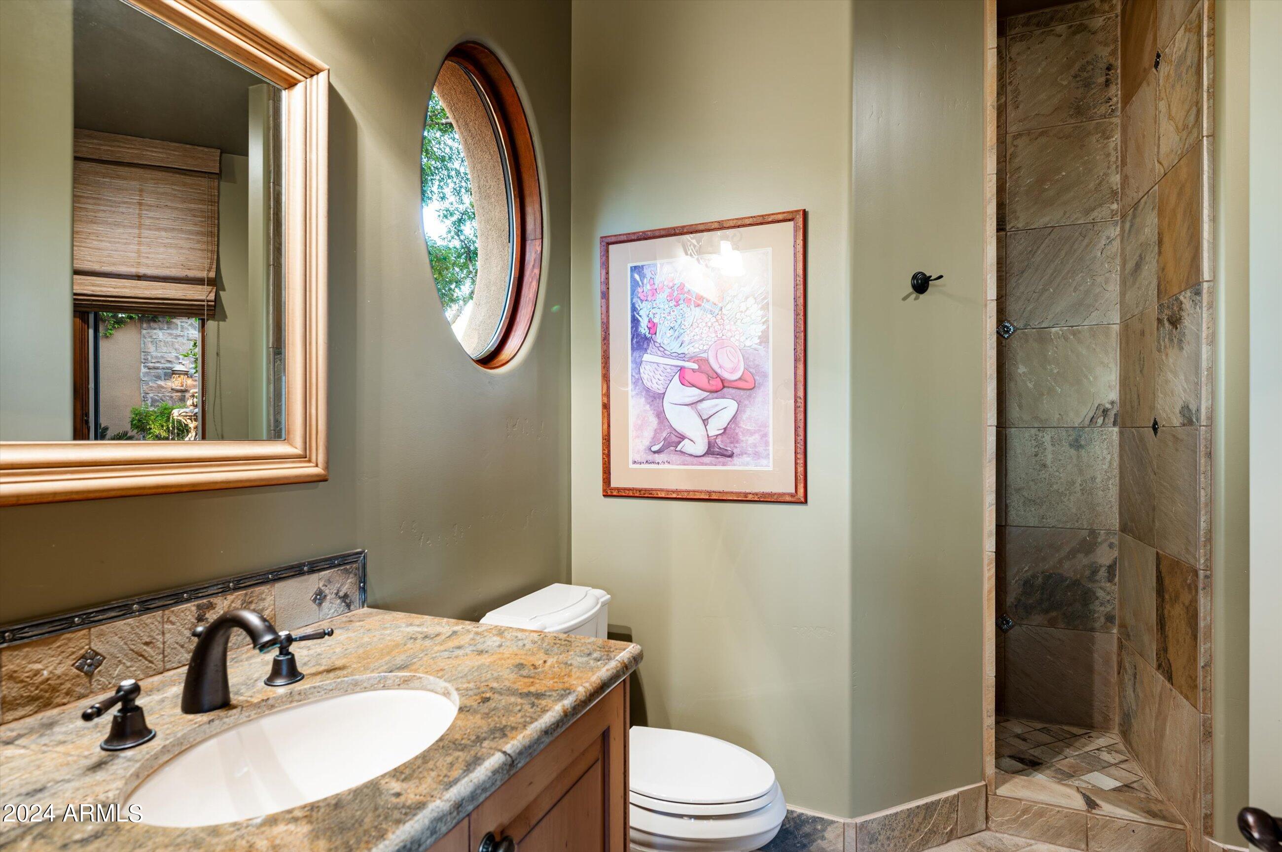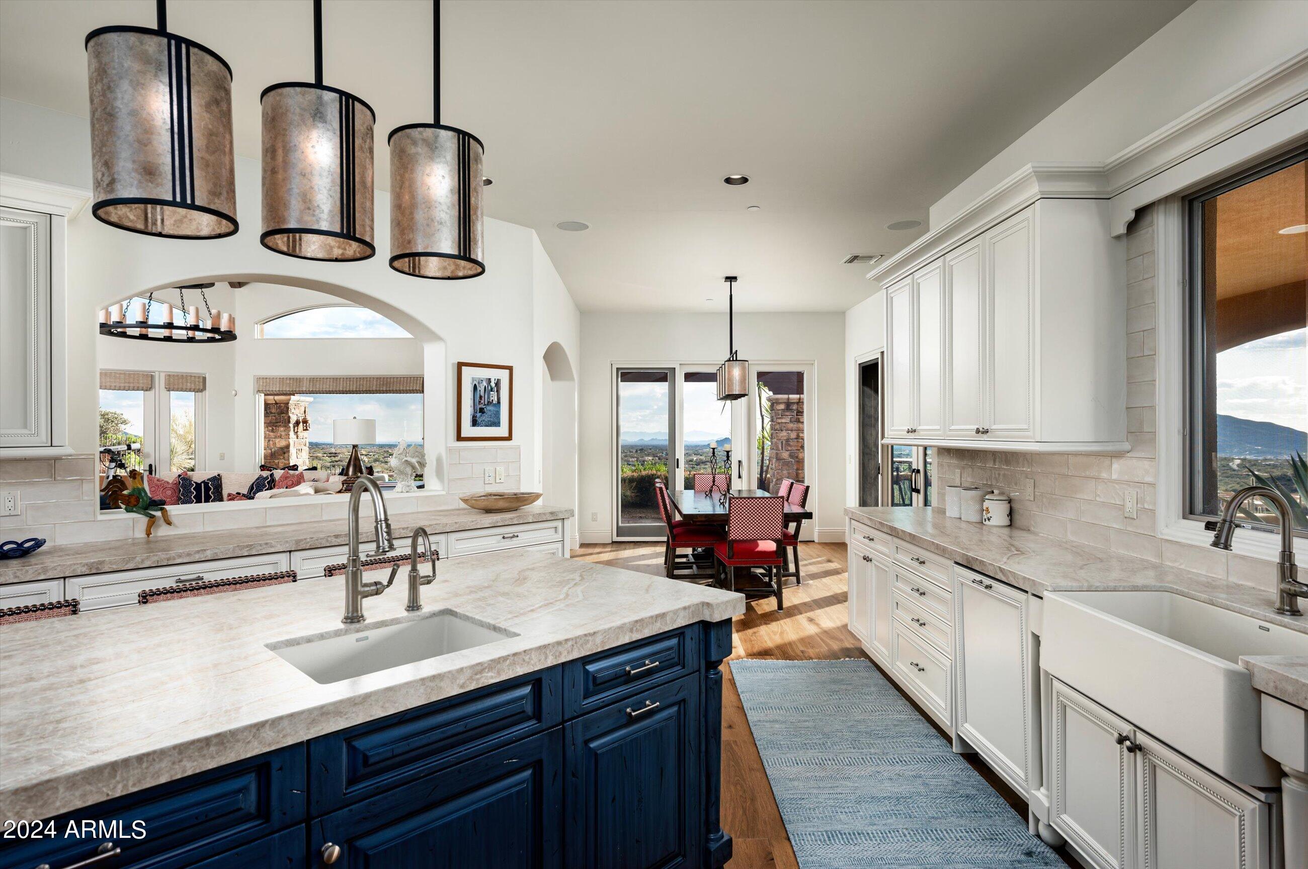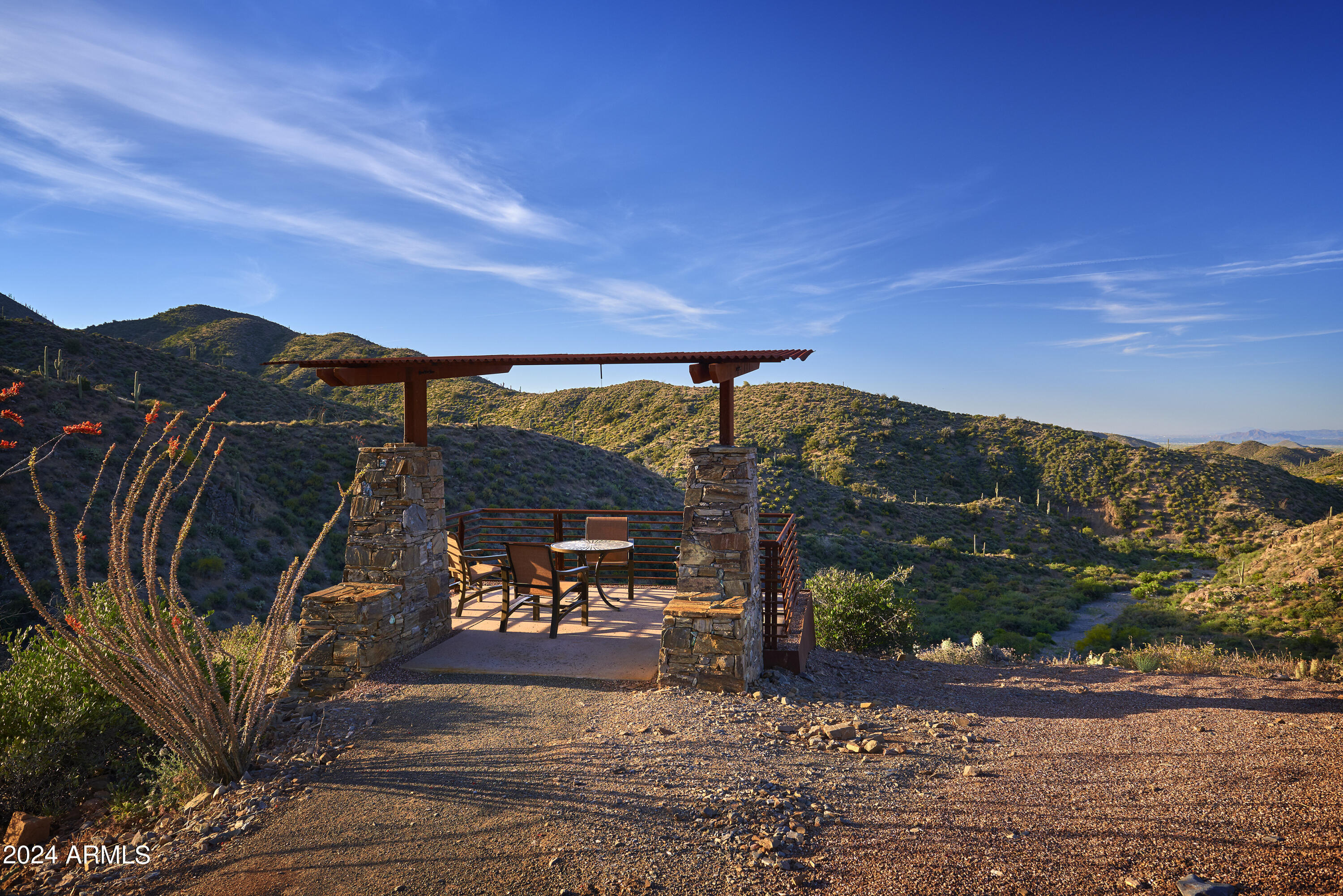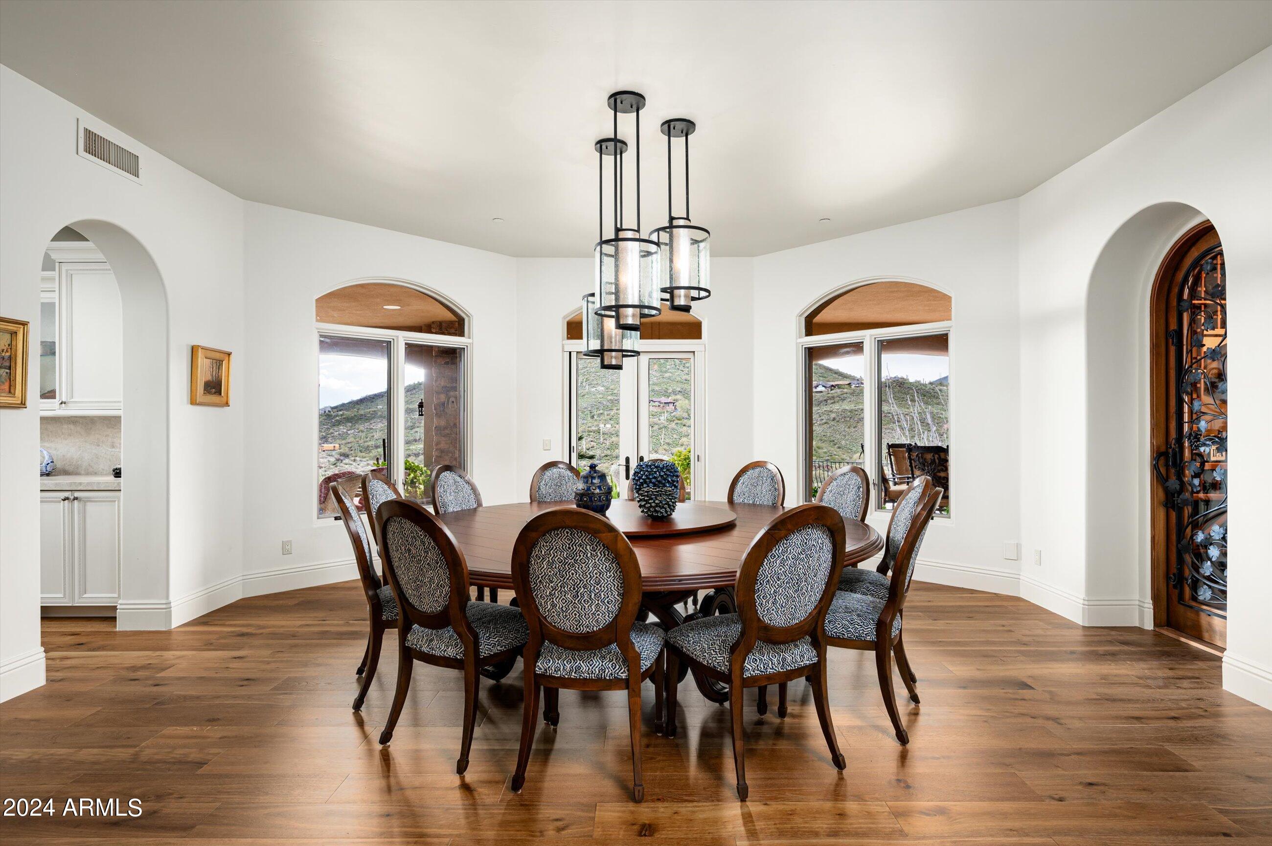 Scenic elevated ~10 acre Santa Barbara estate with breathtaking views of the Valley of the Sun, fabulous Sunsets and City Light Views can be yours forever. This home features 2 separate Guest Houses, 4 car garage, Great Room, Media Room, 2 offices, wet bar, wine room, and 5 En-suite Bedrooms all on 1 level + Exercise Room on Lower level. Lushly landscaped patios and grand-view pool deck are graced by 3 sparkling water features and Juliet balcony. Main home 3 En-suite Bedrooms open to interior courtyard w/water feature. Every possibility for seamless, indoor/outdoor living has been thoughtfully designed into this High Sonoran Retreat. Golf Membership available to transfer from Seller and furnishings excluding art are available under separate Bill of Sale.
